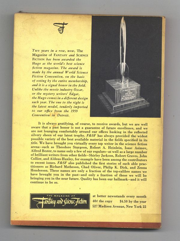 Volume 17, Issue 6 - December 1959. Cover by Mel Hunter. Fantasy and science fiction stories by Mark Clifton, Gerard E. Neyroud, Marcel Ayme, Stephen Barr, Jane Rice, Grendel Briarton, Damon Knight, Charles Beaumont and Robert Nathan. Science article by Isaac Asimov. Softcover. 5.5-in. x 7.5-in. 130 pages, Text. Cover price $0.40.