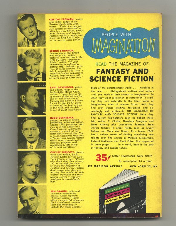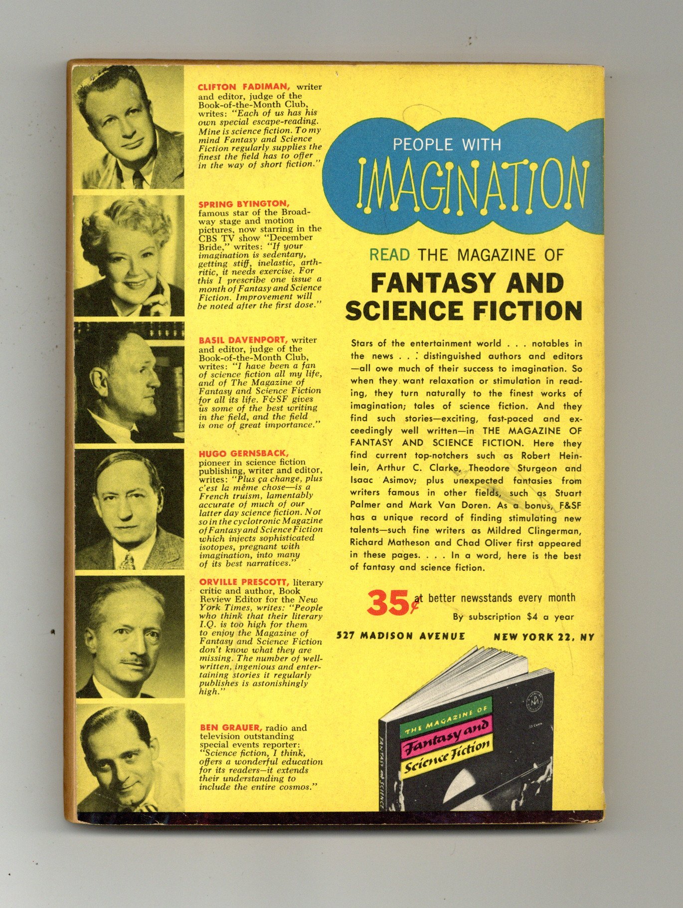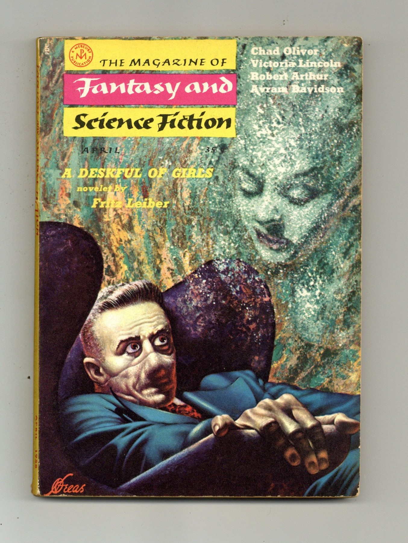 Volume 14, Issue 4 - March 1958. Cover by Kelly Freas. Fantasy and science fiction stories by Chad Oliver, Robert Arthur, Avram Davidson, Kit Reed, Victoria Lincoln, Mararet St. Clair (as Idris Seabright), Mark Van Doren, Arthur Oesterreicher, Fritz Leiber and Brian W. Aldiss. Softcover, 5 1/2-in. x 7 1/2-in., 128 pages, B&W. Cover price $0.35.