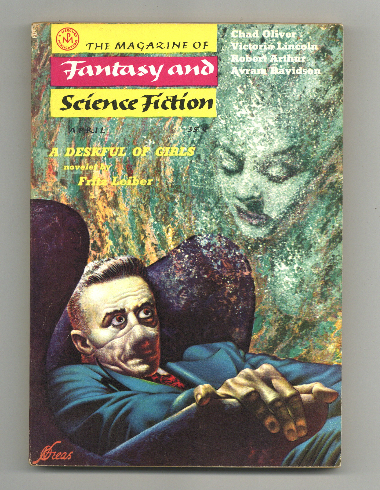Published Apr 1958 by Mercury Publications.$10.00Volume 14, Issue 4 - March 1958. Cover by Kelly Freas. Fantasy and science fiction stories by Chad Oliver, Robert Arthur, Avram Davidson, Kit Reed, Victoria Lincoln, Mararet St. Clair (as Idris Seabright), Mark Van Doren, Arthur Oesterreicher, Fritz Leiber and Brian W. Aldiss. Softcover, 5 1/2-in. x 7 1/2-in., 128 pages, B&W. Cover price $0.35.