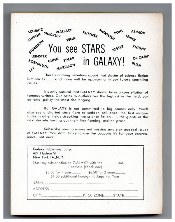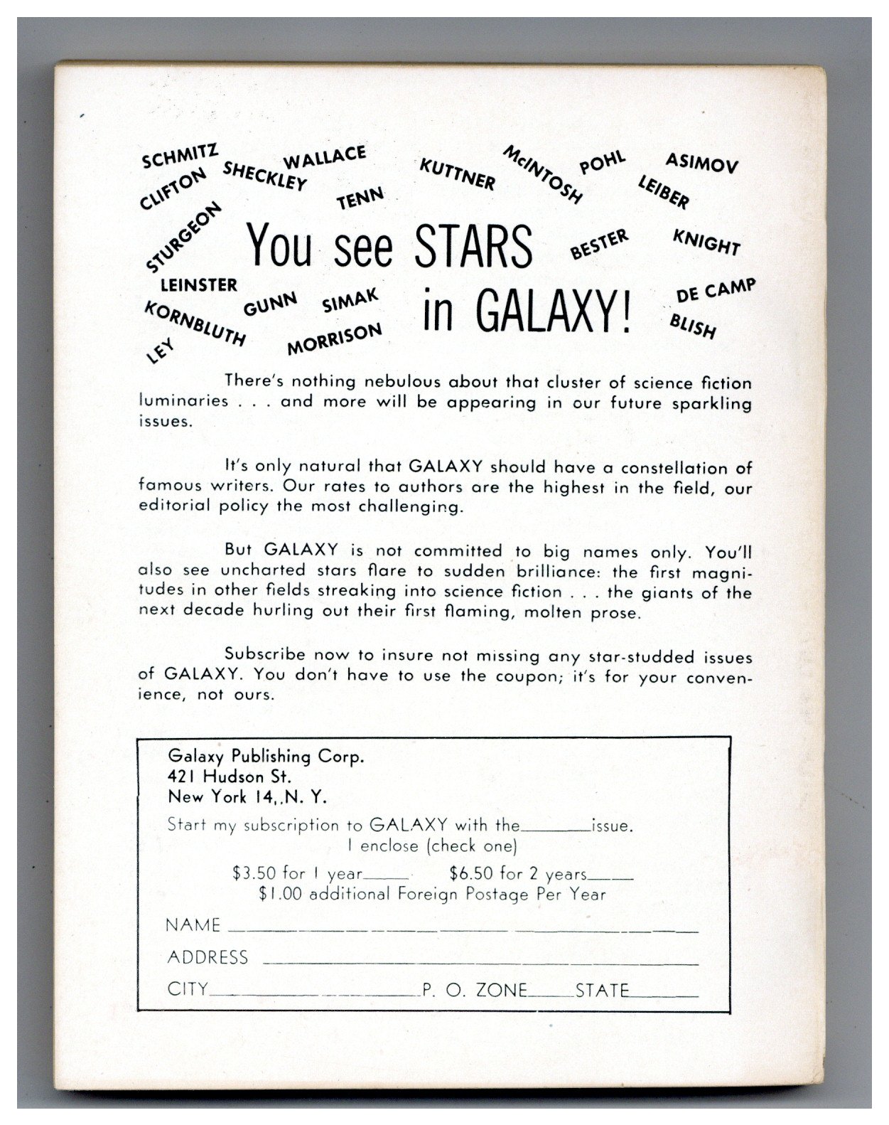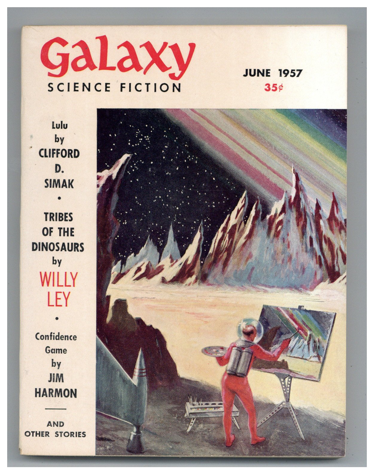 Published Jun 1957 by Galaxy Publications.$11.00Volume 14, Issue 2 - June 1957. Cover by Kirberger. Stories include "Lulu" by Clifford D Simak, "The Hardest Bargain" by Evelyn E. Smith, and "Confidence Game" by Jim Harmon. 5.25-in. x 7.5-in.; 144 Pages, B&W. Cover price $0.35.