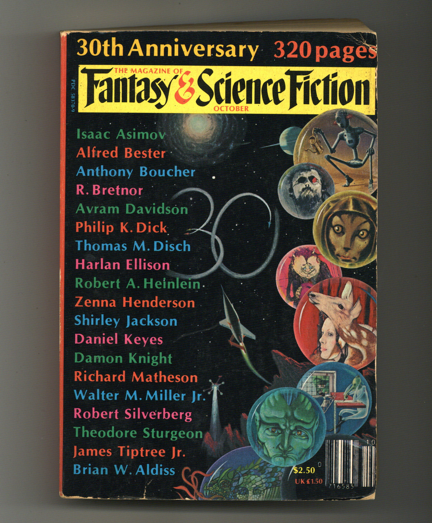 Volume 57, Issue 4 - October 1979. 30th Anniversary Issue. Cover by Tom Bevans. Fantasy and science fiction stories by Isaac Awsimov, Alfred Bester, Anthony Boucher, R. Bretnor, Avram Davidson, Philip K. Dick, Thomas M. Disch, Harlan Ellison, Robert A. Heinlein, Zenna Henderson, Shirley Jackson, Daniel Keyes, Damon Knight, Richard Matheson, Walter M. Miller Jr., Robert Silverburg, Theodore Sturgeon, Jame Tiptree Jr, and Brian W. Aldiss. 5 1/2-in. x 7 1/2-in., 162 pages, B&W Cover price $1.25.