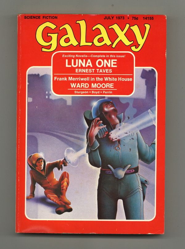 Published Jul 1973 by Galaxy Publications.$18.00July 1973. Incorrectly numbered Vol 34 No. 7 on the inside by the publisher (should be Vol 33). Cover by Chris Achilleos. Science fiction stories by Ernest Taves, Ward Moore, John Boyd, Jeffery Perrin, Buddy Saunders, Howard Waldrop. Illustrations by Jack Gaughan. 5-1/4-in. x 7-1/4-in.; b&w text with spot illustrations; 176 newsprint pages. Cover price $0.75.