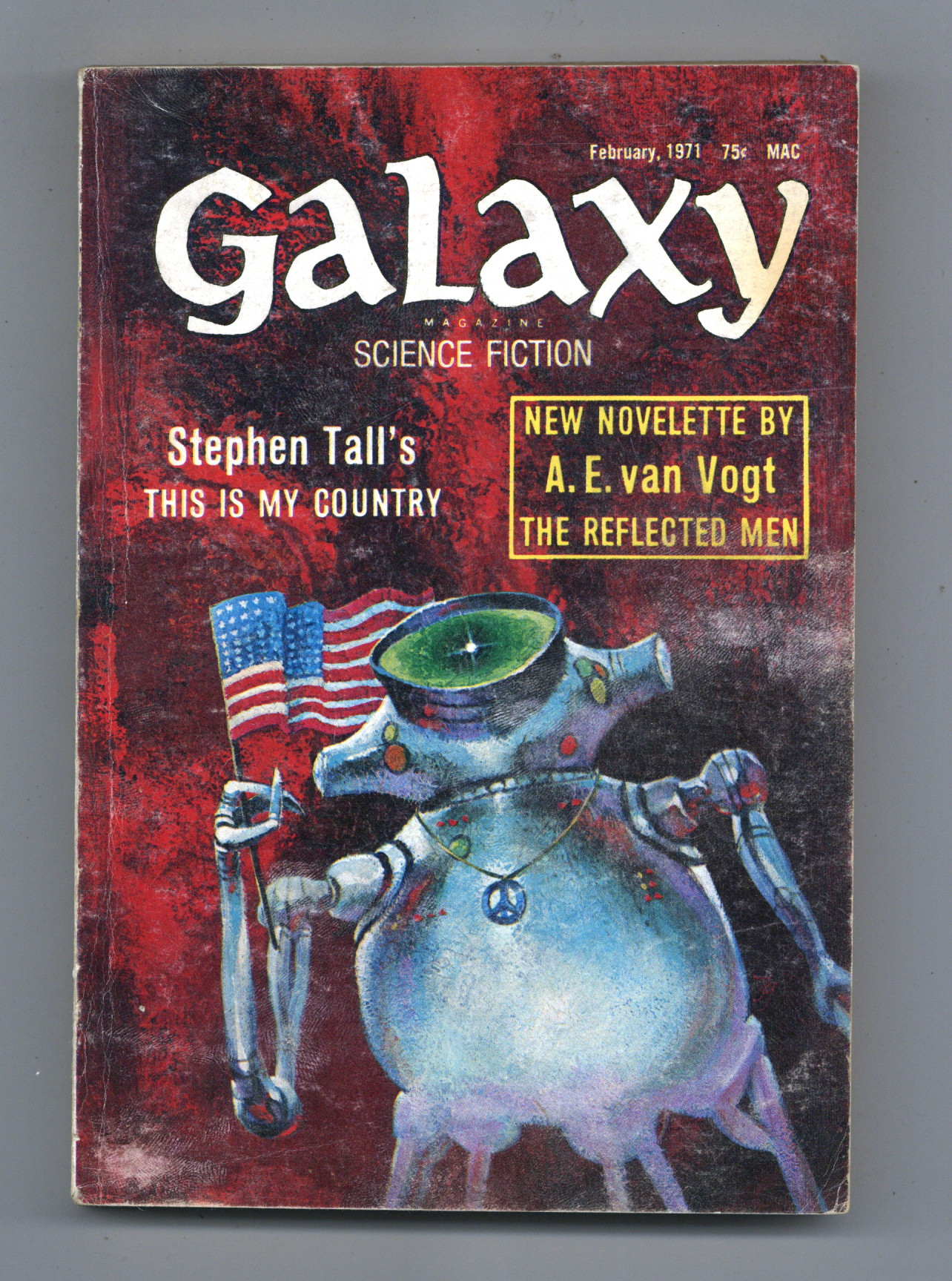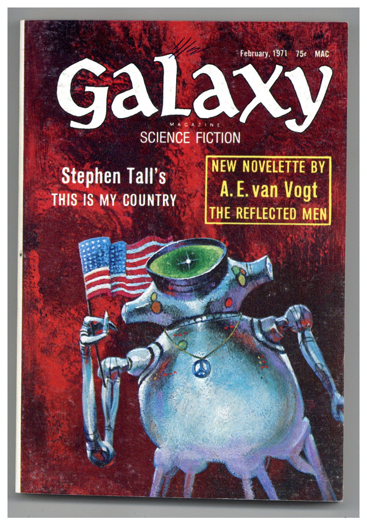 Published Feb 1971 by Galaxy Publications.$10.00Cover by Jack Gaughan. "Hero" by George R. R. Martin (1st published work). Other science fiction stories by Stephen Tall, A. E. Van Vogt, Ben Bova, Robert Sheckley, John Rankine, Michael G. Conway, Dan Morgan. Illustrations by Gaughan, Rotsler. Softcover Pulp Digest, 5-in. x 7-in.; 192 Pages, B&W. Cover price $0.75.