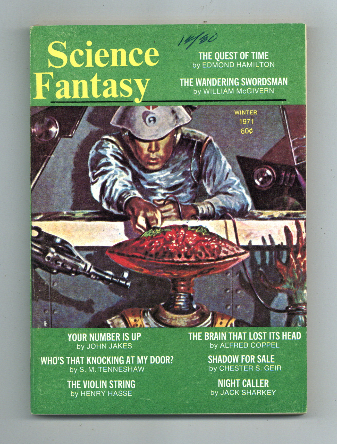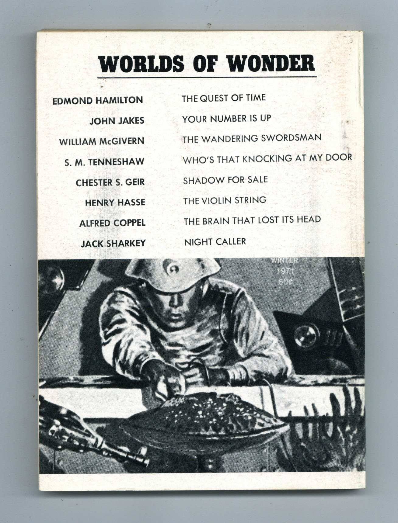 Published 1971 by Ultimate Publishing Company.$12.00Winter 1971. Reprints from Amazing Stories and Fantastic Adventures."The Quest of Time" by Edmond Hamilton, "Your Number is Up" by John Jakes, "The Wandering Swordsman" by William McGivern, "Who's That Knocking at My Door" by S.M. Tenneshaw, "Shadow For Sale" by Chester S. Geir, "The Violin String" by Henry Hasse, "The Brain That Lost Its Head" by Alfred Coppel, and "Night Caller" by Jack Sharkey. Cover price $0.60.