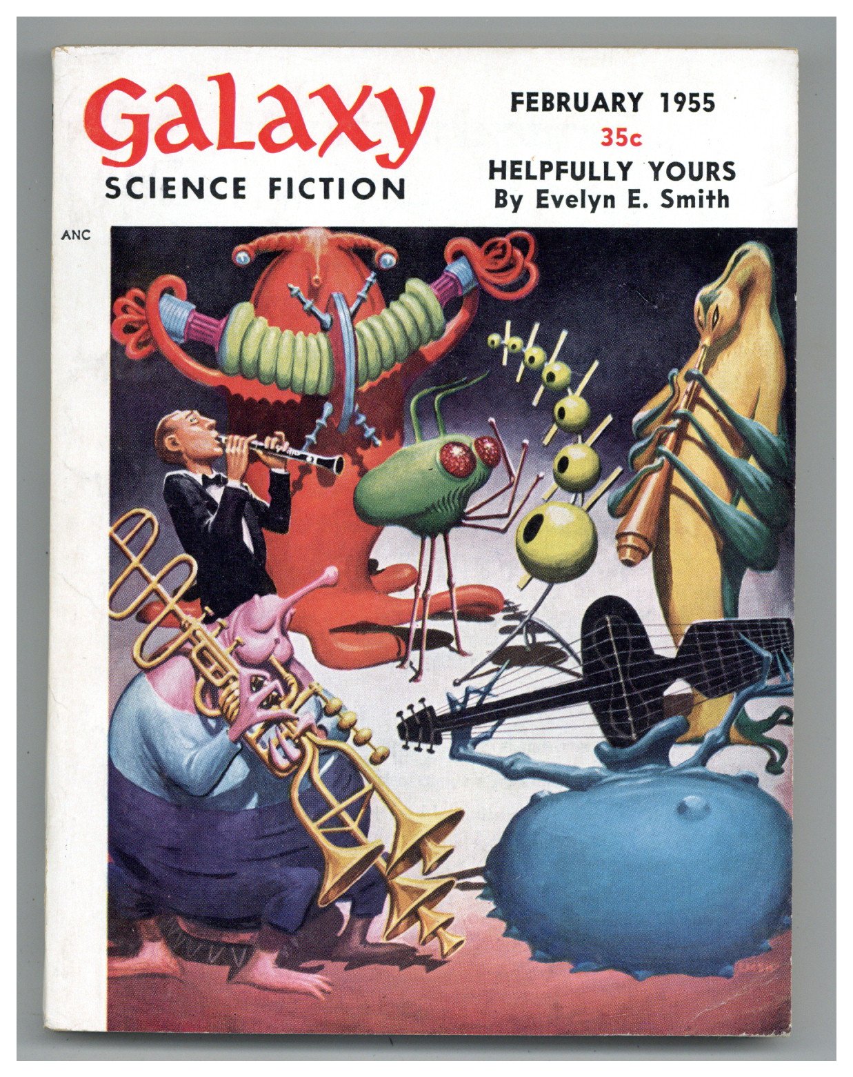 Published Feb 1955 by Galaxy Publications.$17.50February 1955. Cover by Emsh. Stories: "Helpfully Yours" by Evelyn E. Smith, "Rich Living" by Michael Cathal, "The Cave of Night" by James E. Gunn, "Dead Man's Planet" by William Morrison, "Open House" by J.T. McIntosh, "Pythias" by Frederik Pohl, and "Blind Spot" by Bascom Jones Jr. 5.25-in. x 7.5-in.; 144 Pages, B&W. Cover price $0.35.