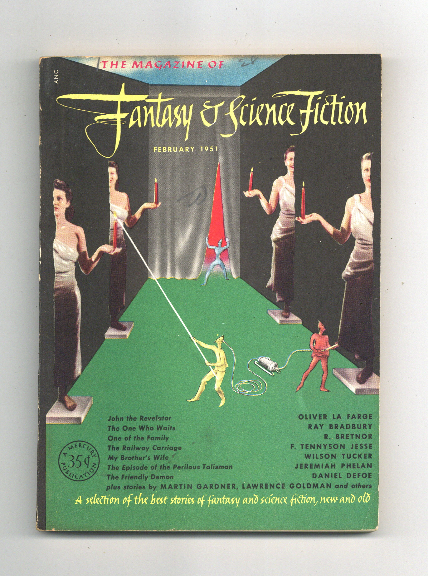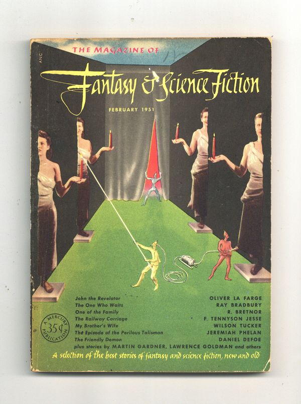 Tags: Anthology / CollectionPublished Feb 1951 by Mercury Publications.$8.80Cover by George Salter. Fantasy and science fiction stories by Oliver La Farge, R. Bretnor, Lawrence Goldman, Gene Hunter, Ray Bradbury, Wilson Tucker, Daniel Defoe, Graves Taylor, Matrin Gardner, Will Stanton, F. Tennyson Jesse, Maurice Murphy, and C. Daly King (as Jeremiah Prelan). Softcover. 5.5-in. x 7.5-in. 132 pages, black and white (all text). Cover price $0.35.