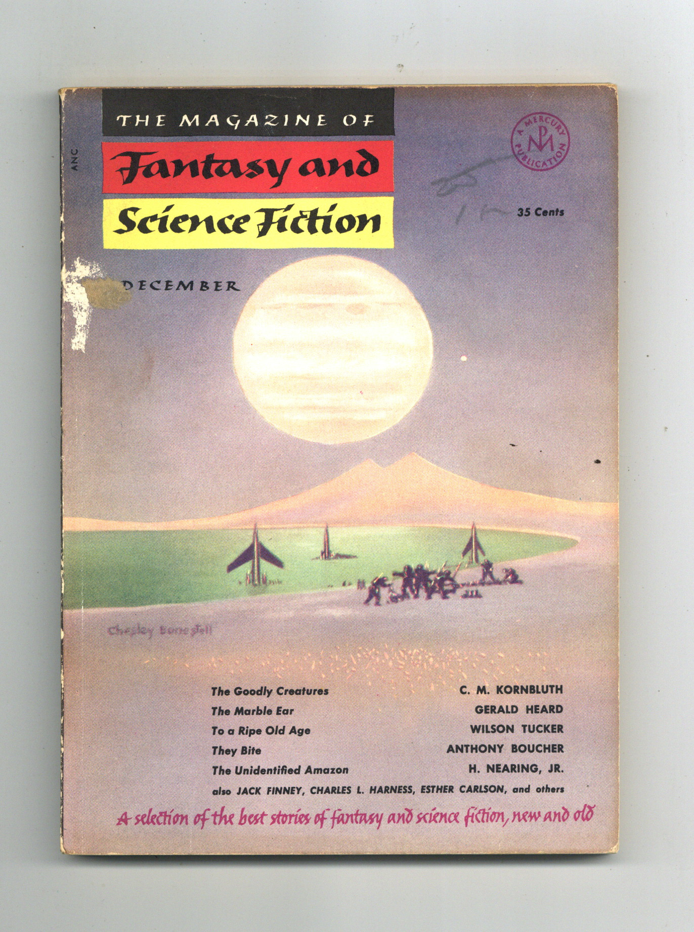 Tags: Anthology / CollectionPublished Dec 1952 by Mercury Publications.$8.00December 1952. Cover by Chesley Bonestell. Fantasy and science fiction stories by Wilson Tucker, Esther Carlson, Charles L. Harness, Jack Finney, Richard Goggin, H. Nearing Jr, C. M. Kornbluth, Gerald Heard, Anthony Boucher, and Ron Goulart. Softcover. 5.5-in. x 7.5-in. 132 pages, black and white (all text). Cover price $0.35.