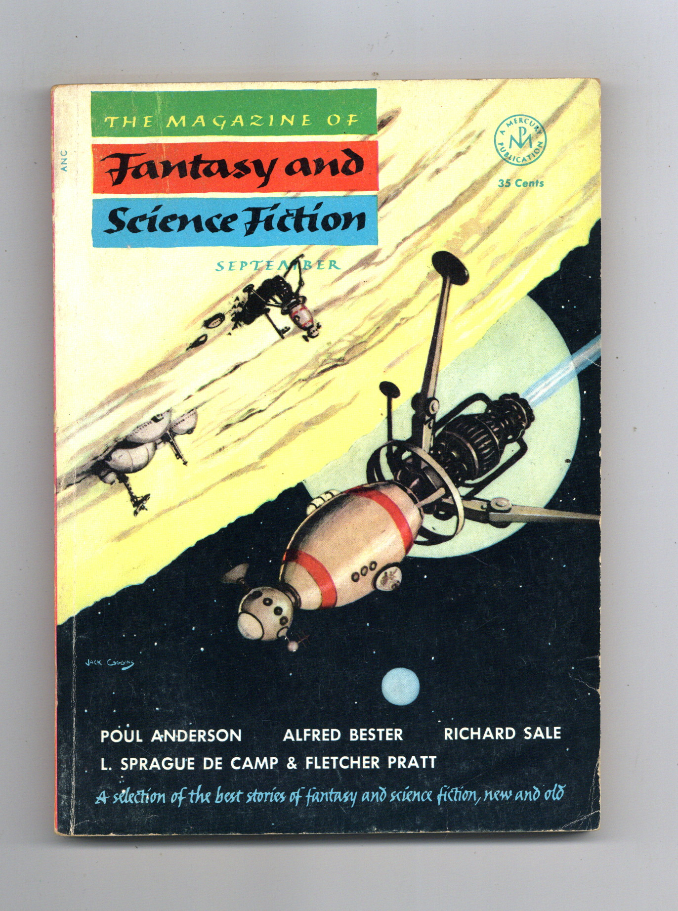 Tags: Anthology / CollectionPublished Sep 1953 by Mercury Publications.$7.20September 1953. Cover by Jack Coggins. Fantasy and science fiction stories by Poul Anderson, L. Sprague DeCamp & Fletcher Pratt, Alan Nelson, Lion Miller, Christopher Wood, Richard Sale, Thelma D. Hamm, Alfred Bester, and Peter Phillips. Softcover. 5.5-in. x 7.5-in. 132 pages, black and white (all text). Cover price $0.35.