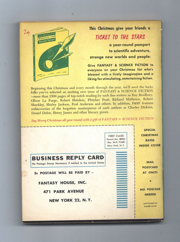 Cover by Nick Solovioff. "One Ordinary Day, With Peanuts" by Shirley Jackson, plus more fantasy and science fiction stories by J. T. McIntosh, Pauline Clarke, William Sansom, Mack Reynolds, Robert Abernathy, Martin Gardner, Emyr Humphreys, Alan Nelson, Isaac Asimov, and John Dickson Carr. Softcover. 5.5-in. x 7.5-in. 132 pages, black and white (all text). Cover price $0.35.