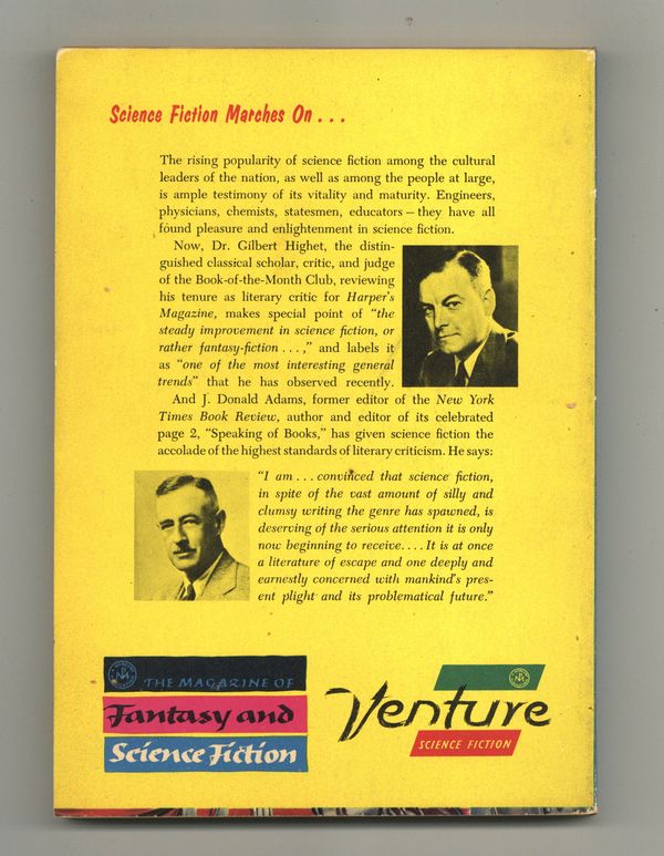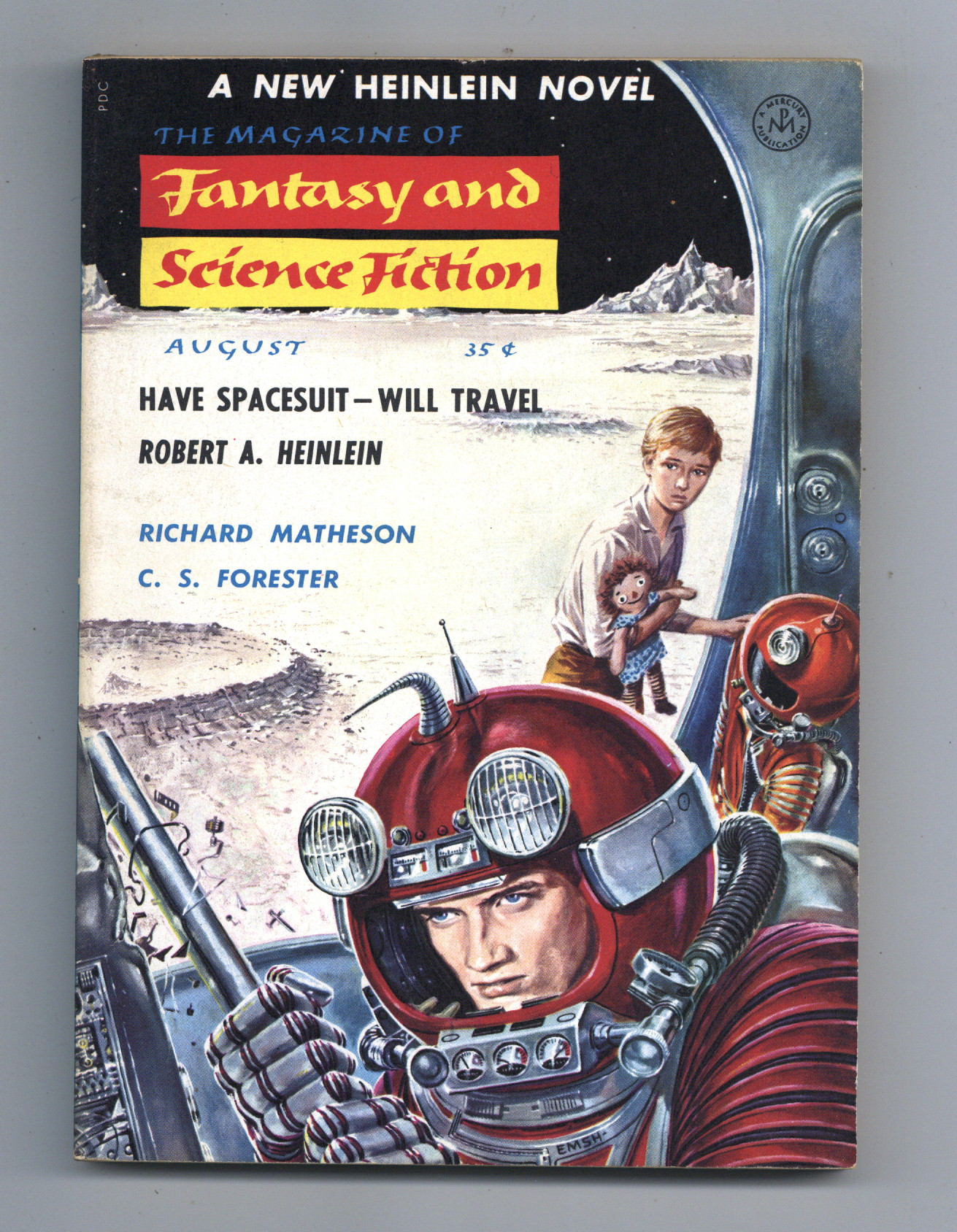 Tags: Anthology / CollectionPublished Aug 1958 by Mercury Publications.$14.25Cover by Ed Emshwiller. "Have Spacesuit - Will Travel" 1/3 by Robert A. Heinlein, "The Edge" by Richard Matheson and "Marjorie is Still Waiting" by C. S. Forester, plus more science fiction and fantasy stories by Robert P. Mills, Leslie Jones, Alex Apostolides, Avram Davidson, Grendel Briarton, and Charles G. Finney. Softcover, 5.5-in., x 7.5-in., 130 pages, black and white (all text) Cover price $0.35.