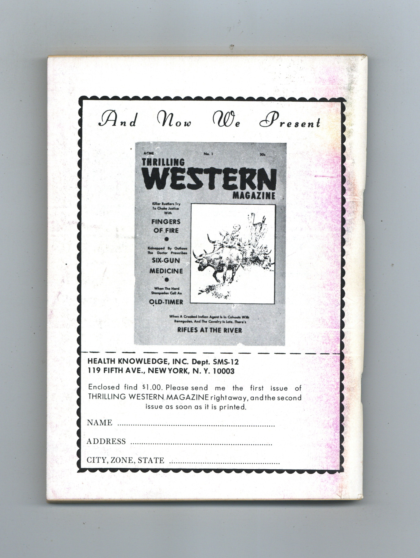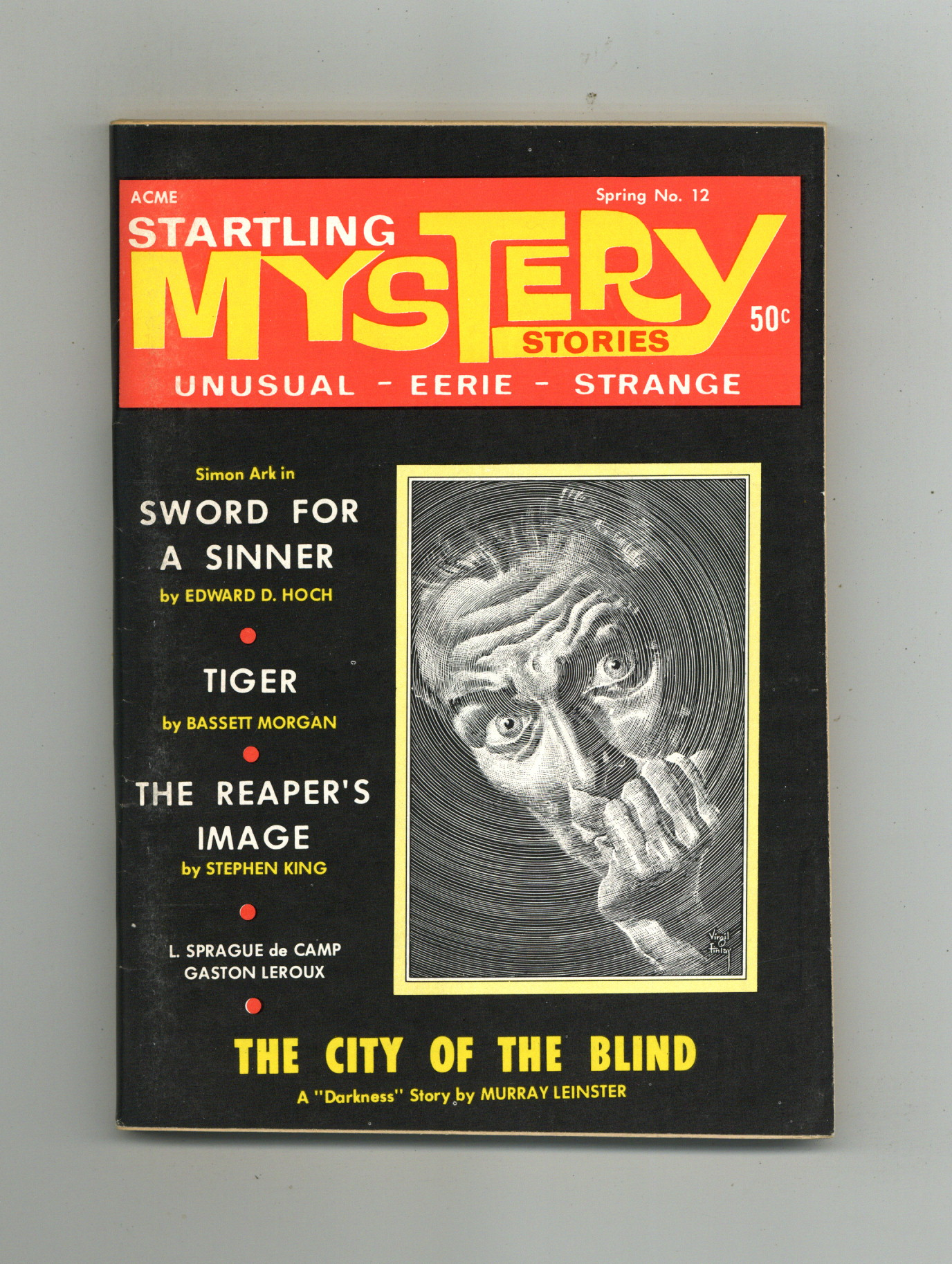 Published Mar 1969 by Health Knowledge.$450.00No. 12 - March , 1969. Includes "The Reaper's Image", Stephen King's second published story and first professional appearance on a magazine cover. 5.5" x 7.25", 130 pages, B&W. Cover price $0.50.