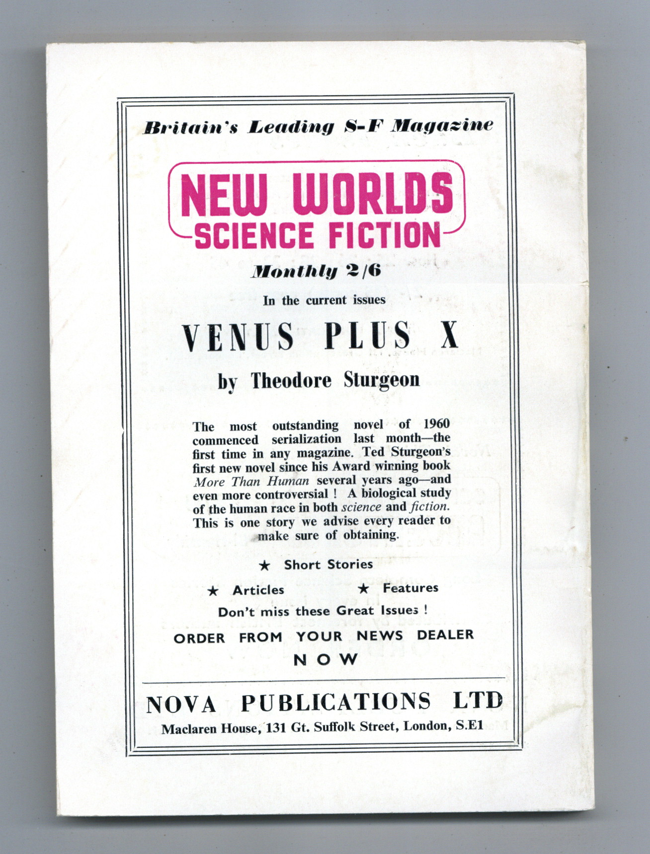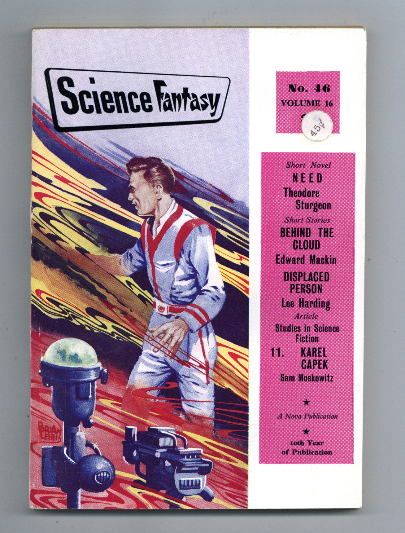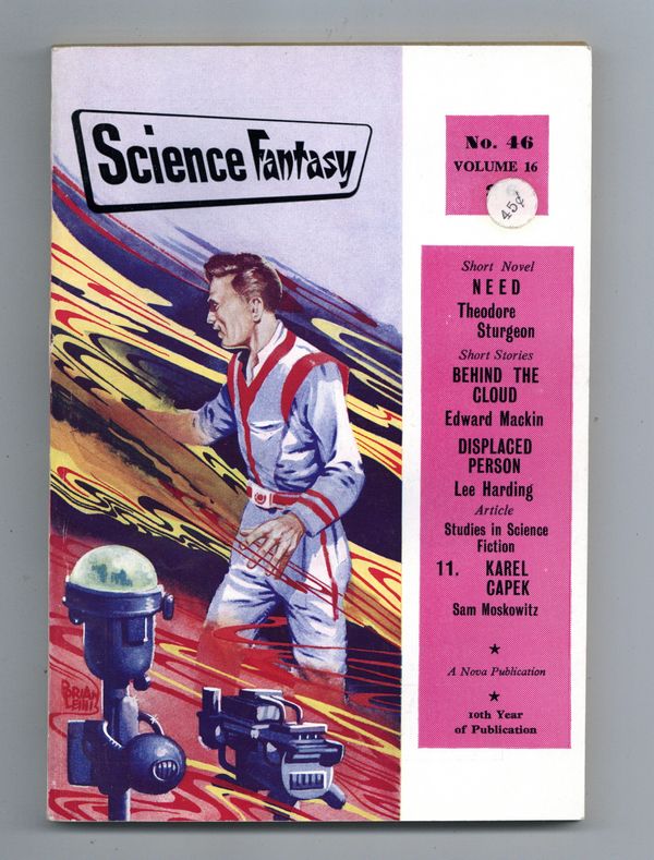 Published Apr 1961 by Nova Publications.$17.50Vol. 16 #46 -April 1961. Science Fantasy, which later became Impulse and then SF Impulse, was a UK published science-fiction and fantasy digest that began production in the Summer of 1950 and was distributed by Nova Publications as a companion to Nova's New Worlds. When Nova went out of business in early 1964, The title was changed to Impulse in early 1966, to little avail, and then changed once more to SF Impulse for the last few issues. Science Fantasy ceased publication the following year, after the printer went bankrupt. Edited by John Carnell. Stories by Theodore Sturgeon and others. Article by Sam Moskowitz. Cover by Brian Lewis. 5 1/4-in. x 7 3/4-in., 112 pages, black and white.