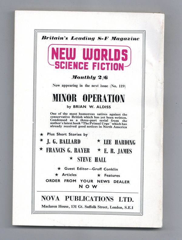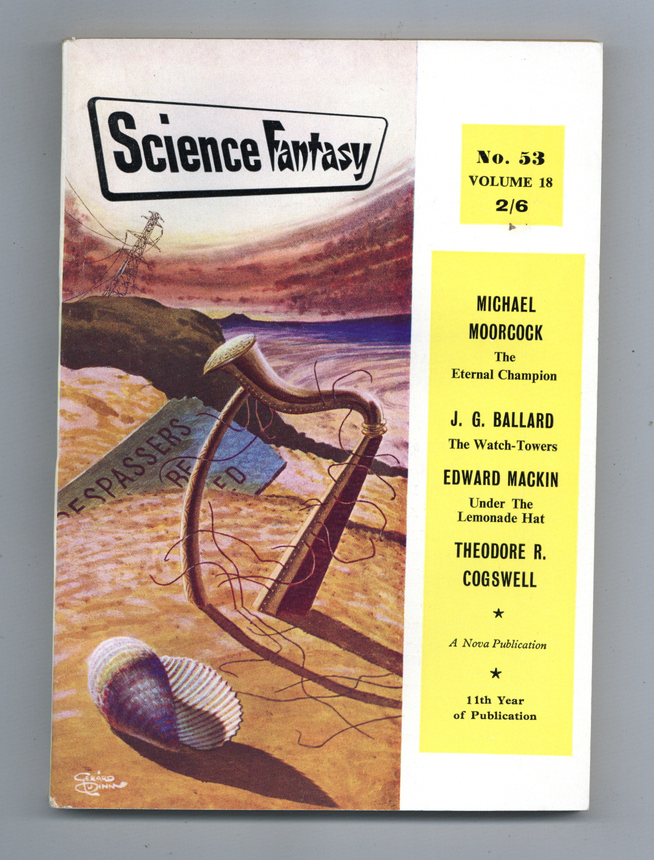 Published Jun 1962 by Nova Publications.$32.00Vol. 18 #53 - June 1962. Science Fantasy, which later became Impulse and then SF Impulse, was a UK published science-fiction and fantasy digest that began production in the Summer of 1950 and was distributed by Nova Publications as a companion to Nova's New Worlds. When Nova went out of business in early 1964, The title was changed to Impulse in early 1966, to little avail, and then changed once more to SF Impulse for the last few issues. Science Fantasy ceased publication the following year, after the printer went bankrupt. Edited by John Carnell. Stories by Michael Moorcock, J.G. Ballard, Theodore Cogswell. Cover by Gerard Quinn. 5 1/4-in. x 7 3/4-in., 112 pages, black and white.