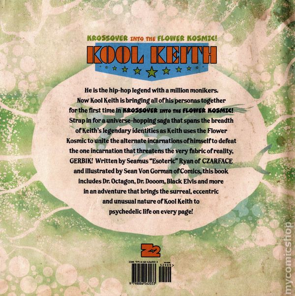 1st printing. Written by Seamus Esoteric" Ryan. Art and cover by Sean Von Gorman. He is the hip-hop legend with a million monikers. Now Kool Keith is bringing all of his personas together for the first time in Krossover into the Flower Kosmic!. Strap in for a universe-hopping saga that spans the breadth of Keith's legendary identities as Keith uses the Flower Kosmic to unite the alternate incarnations of himself to defeat the one incarnation that threatens the very fabric of reality, GERBIK! Written by Seamus Esoteric Ryan of CZARFACE and illustrated by Sean Von Gorman of Comics, this book includes Dr. Octagon, Dr. Dooom, Black Elvis and more in an adventure that brings the surreal, eccentric and unusual nature of Kool Keith to psychedelic life on every page! Hardcover, 8-in. x 8-in., 100 pages, full color. Teen