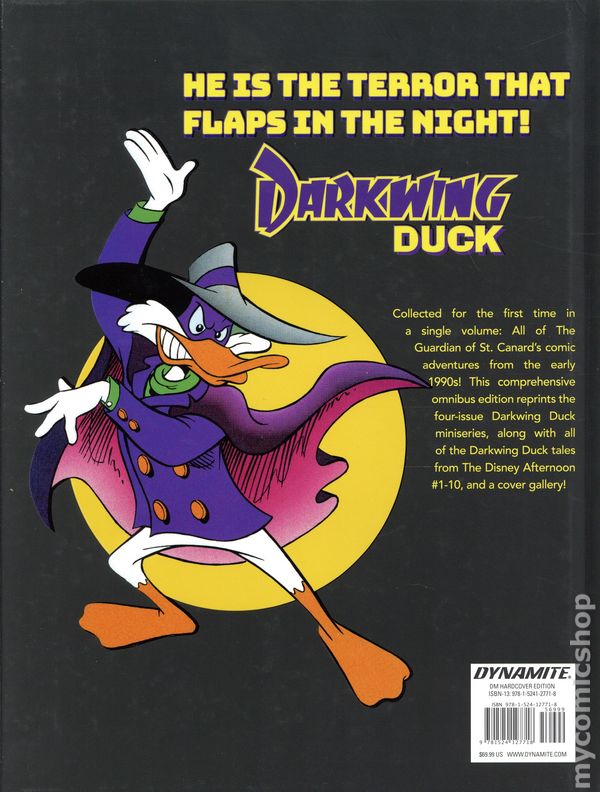 Volume 1 - 1st printing. "The Darkly Dawns the Duck!" Collects Darkwing Duck (1991 Walt Disney) #1-4 and The Disney Afternoon (1994) featuring Darkwing Duck #1-10. Written by John Blair Moore, Brian Swenlin, Paul S. Newman, Roger Brown, Doug Murray, Jerry A. Novick, Steve Sullivan, and Janet Gilbert. Art by John Blair Moore, George Wildman, Michael James, Andres Klacik, Rick Stasi, Fred Gorham, Cosme Quartieri, Carlos Valenti, Bill Fugate, Glen Hay, Carol Newman, Natalio Zirulnik, Joe Messerli, Walter Carzon, Loretta Krol, and Matt Maley. Cover by John Blair Moore. RETURN TO ST. CANARD WITH THIS CLASSIC COMICS COMPENDIUM! In 1991, the original animated adventures of Darkwing Duck debuted on The Disney Afternoon and ABC. Over the next two years, 91 episodes were aired, and the critically acclaimed series won a legion of die-hard fans while becoming a cultural touchstone for a generation. This runaway success launched DW into the comics world as well, with a four-issue Darkwing Duck miniseries appearing in 1991, followed by a year-long run in the first 10 issues of The Disney Afternoon magazine in 1994. Now, over 30 years later, Dynamite is proud to add to the legacy of the Duck Knight by bringing these timeless tales back into print in an all-new omnibus edition! Reprinted here for the first time in a single softcover volume are all of the Guardian of St. Canards comic book adventures from the original Darkwing Duck miniseries and The Disney Afternoon #1-10. This comprehensive collection also features a complete cover gallery from the original publications! Hardcover, 248 pages, full color. Cover price $69.99.