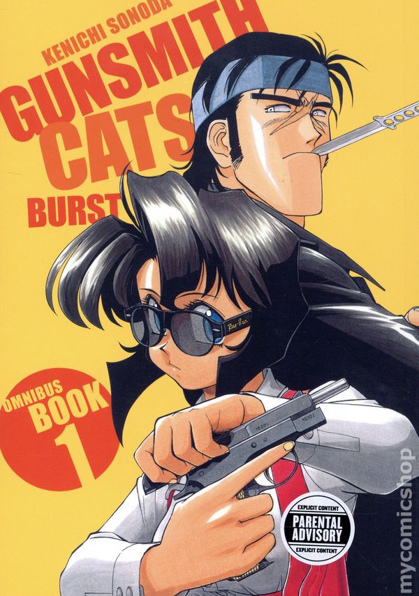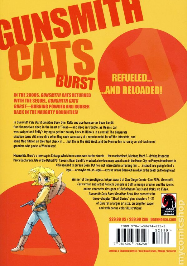 Volume 1 - 1st printing. Collects Gunsmith Cats Burst GN (2007-2010 Dark Horse) Vol. 1-2 and material from Vol. 3. Story and art by Kenichi Sonoda. Translated by Studio Cutie. The sequel to the classic manga Gunsmith Cats! Rallys still catching crooks, while Bean transports them—but now Beans greatest enemy is on his case: obsessed cop Percy Bacharach! Rally Vincent runs Gunsmith Cats—a gun shop in Illinois with her partner, demolitions expert and former call girl Minnie-May Hopkins. But Rallys real job doesnt pay the bills, her hobby does. And her hobby is bounty hunting, bringing the most wanted men and women in the Chicago area to justice—dressed in her sharp suit and tie, and driving her Shelby Cobra GT 500! In Gunsmith Cats Burst Omnibus Volume 1, Rally and ace transporter Bean Bandit find themselves well outside city limits—and deep in the heart of Texas! After Beans own vehicle is swiped, Rally hires Bean to get her and her bounty back all the way back to Chicago in a rental car…except it turns out it only had half a tank, and pretty soon Beans got to push! The desperate situation turns still more dire when they seek sanctuary at a remote motel far off the interstate, and some Mob hitmen on their trail check in…but this is the Wild West, and the Monroe Inn is run by an old-fashioned grandma who packs a Winchester rifle! Meanwhile, there's a new cop in Chicago who's from some even harder streets—the mustachioed, Mustang Mach 1-driving Inspector Percy Bacharach, late of the Detroit P.D. It seems Bean Bandits wrecked a few too many squad cars in the Motor City, so Percy's transferred to Chicagoland to pursue Bean. But he's not interested in arresting him. Instead he's going to find a legal—or maybe not-so-legal—excuse to take Bean out in a duel to the death on the highway! The Gunsmith Cats Burst Omnibus is using the 2000s unflopped version of the manga, so that it reads in the original Japanese style, from right to left. Softcover, 5-in. x 7-in., 485 pages, B&W. Mature Readers Cover price $29.99.
