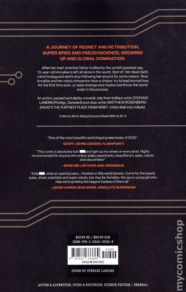 1st printing. Collects We're Taking Everyone Down With Us (2025 Image) #1-6. Written by Matthew Rosenberg. Art and cover by Stefano Landini. James Bond meets The Island of Doctor Moreau in this graphic novel about a young girl who discovers her father isn't the hero she believed, but one of the most dangerous super-spy villains on the planet. After her mad-scientist father is killed by the world's greatest spy, 13-year-old Annalise is left all alone in the world. Sort of. Her dead dad's robot bodyguard won't stop following her around for some reason. Now Annalise has a choice: try to lead a normal life for the first time ever…or seek revenge and maybe overthrow the world order in the process. Embark on a journey of regret and retribution, super spies and pseudoscience, growing up and global domination from brilliant artist STEFANO LANDINI (Prodigy, Hellblazer) and okay writer MATTHEW ROSENBERG (Whats the Furthest Place From Here?, Uncanny X-Men). Softcover, 256 pages, full color. Mature Readers NOTE: One of the most beautiful and intriguing new books of 2025." —Geoff Johns (Geiger, Flashpoint) Cover price $19.99.