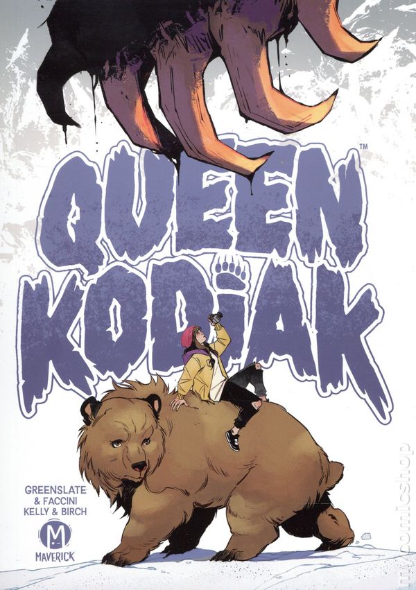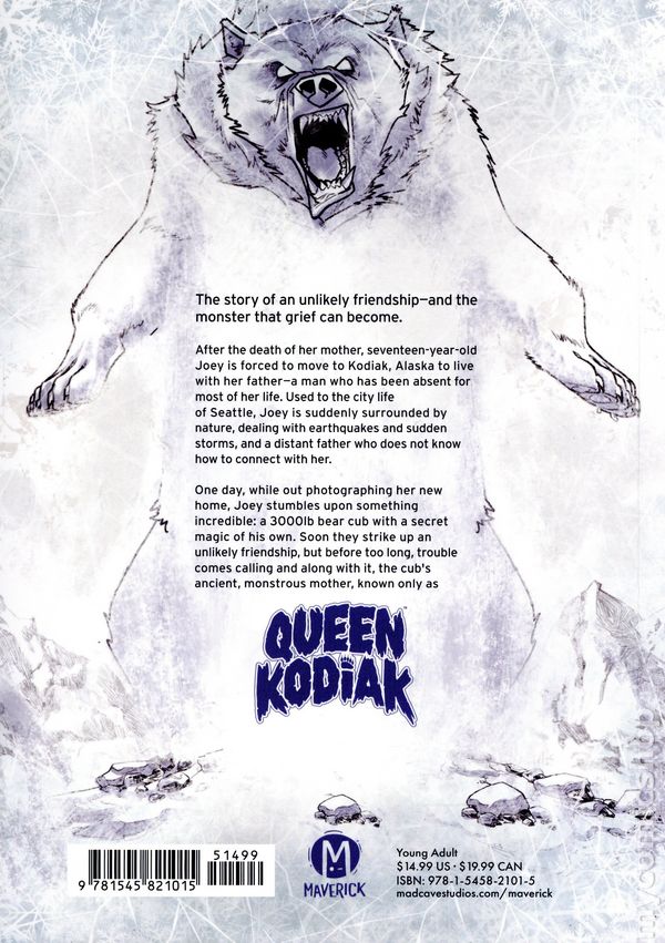 1st printing. Written by Christopher Greenslate. Art by Riccardo Faccini. Cover by Ornella Savarese. Following in the massive footsteps of legends like Godzilla and King Kong, comes QUEEN KODIAK, a colossal, super-charged Kodiak grizzly bear... one who survived from the ice-age and whose been irreversibly enhanced by a mysterious geo-thermal energy pulsing in the unknown depths of an Alaskan ice cave. And although QUEEN KODIAKs been asleep for thousands of years, melting ice and subsequent tectonic activity has disturbed her hibernation. And in her debut graphic novel, she wakes up to find her only cub missing. But as much as we want to meet her and watch her wreck shop on the pacific northwest (sorry Seattle), our story actually centers on JOEY FOX, an embattled 17-year-old girl, and natural empath, who befriends Queen Kodiak's cub after a tectonic shift in her own life -- the recent passing of her mother. As a result, Joeys been sent to Alaska's Kodiak island to live with the man who left them ten years ago, her state trooper father. In many ways its a story about how families survive overwhelming odds. Softcover, 6-in. x 8 1/2-in., 168 pages, full color. Young Adult Cover price $14.99.