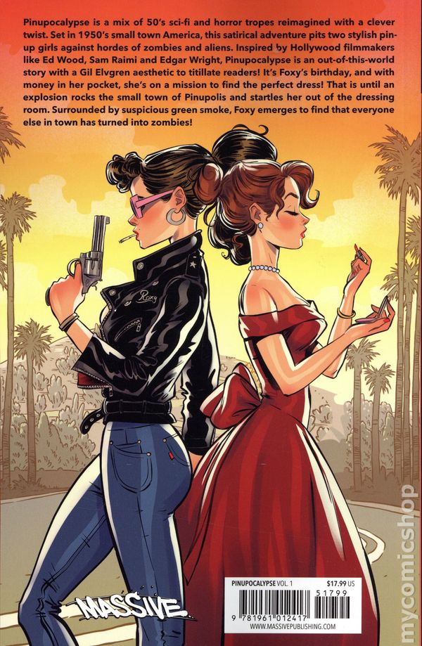 Volume 1 - 1st printing. Collects Pinupocalypse (2025 Massive) #1-6. Written by Andrew Tarusov and Brendan Jones. Art by Andrew Tarusov and Igor Vyunyshov. Cover by Andrew Tarusov. Pinupocalypse is a mix of 50's sci-fi and horror tropes reimagined with a clever twist. Set in 1950's small town America, this satirical adventure pits two stylish pin-up girls against hordes of zombies and aliens. Inspired by Hollywood filmmakers like Ed Wood, Sam Raimi and Edgar Wright, Pinupocalypse is an out-of-this-world story with a Gil Elvgren aesthetic to titillate readers! It's Foxy's birthday, and with money in her pocket, she's on a mission to find the perfect dress! That is until an explosion rocks the small town of Pinupolis and startles her out of the dressing room. Surrounded by suspicious green smoke, Foxy emerges to find that everyone else in town has turned into zombies! Softcover, 176 pages, full color. Teen Cover price $17.99.