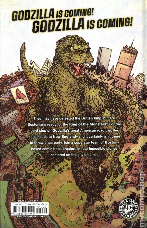 1st printing. Written by Steve Orlando, Jesse Lonergan, Hanna Cha, and Hayden Sherman. Art by Matt Emmons, Jesse Lonergan, Hanna Cha, and Hayden Sherman. Cover by Hayden Sherman. .Back Cover by Jesse Lonergan. Watch out Boston, its not the British! Godzilla is coming! Godzilla is coming! They may have defeated the British king, but are Bostonians ready for the King of the Monsters? Godzilla heads to New England and certainly isn't there to throw a tea party. Join a superstar team of Boston-based comic book creators in four incredible stories centered on the city on a hill. Includes stories by Hayden Sherman (Absolute Wonder Woman, Batman: Dark Patterns), Jessie Lonergan (Mans Best, Miss Truesdale), Steve Orlando (Scarlet Witch, Marauders), Matt Emmons (The Council of Frogs), and Hanna Cha (The Truth About Dragons)! Hardcover, 56 pages, full color. Rated T Cover price $12.99.