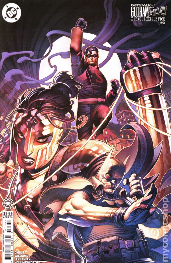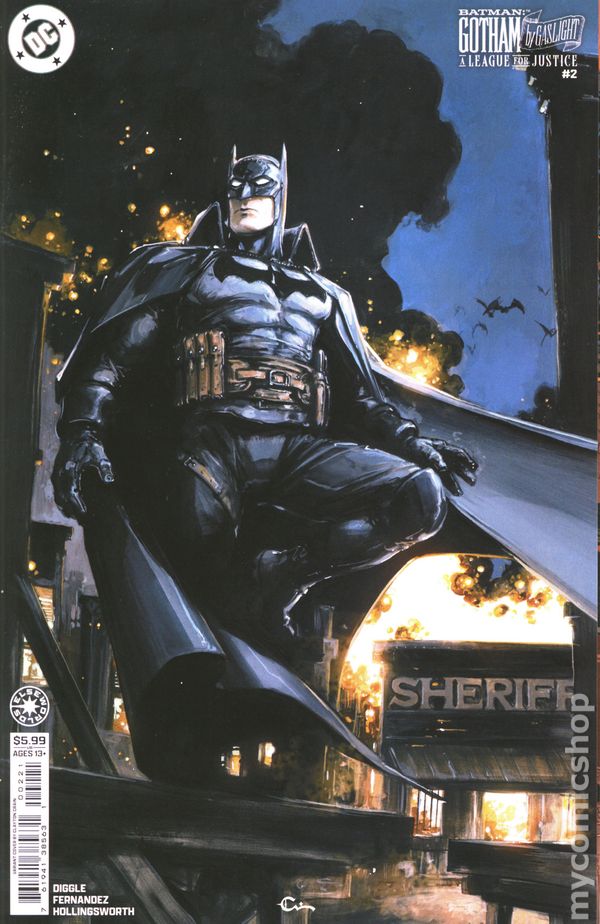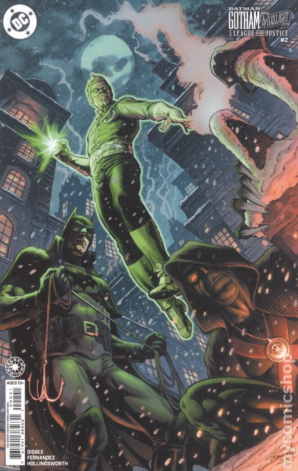 Written by Andy Diggle. Art by Leandro Fernandez. Cover by Sebastian Fiumara. THE GROUNDBREAKING ELSEWORLDS EPIC CONTINUES! Last year, DC's iconic Elseworlds was ushered into a new era with the release of Gotham by Gaslight: The Kryptonian Age, continuing the iconic saga of the Batman of the Victorian era and pulling some of DC's most iconic heroes into the Gilded Age. Now, the team behind the hit series returns to tell the second part of this epic tale in Gotham by Gaslight: A League for Justice! Bear witness to the formation of a new kind of Justice League in a steam-powered adventure that will bring these once-familiar heroes from the open plains of the Midwest to the freezing Arctic as they unravel the mystery of alien artifacts from the Kryptonian Age! This jaw-dropping sequel series is not to be missed! 40 pages, full color. Rated T+ Cover price $5.99.