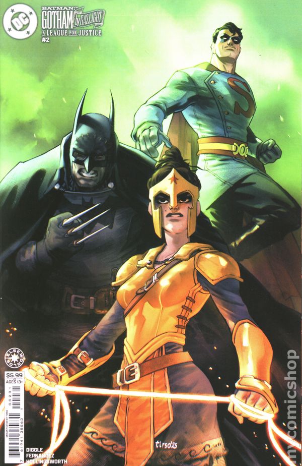 Limited 1 for 25 Retailer Incentive Variant Cover. Written by Andy Diggle. Art by Leandro Fernandez. Cover by Christopher Mitten. THE GROUNDBREAKING ELSEWORLDS EPIC CONTINUES! Last year, DC's iconic Elseworlds was ushered into a new era with the release of Gotham by Gaslight: The Kryptonian Age, continuing the iconic saga of the Batman of the Victorian era and pulling some of DC's most iconic heroes into the Gilded Age. Now, the team behind the hit series returns to tell the second part of this epic tale in Gotham by Gaslight: A League for Justice! Bear witness to the formation of a new kind of Justice League in a steam-powered adventure that will bring these once-familiar heroes from the open plains of the Midwest to the freezing Arctic as they unravel the mystery of alien artifacts from the Kryptonian Age! This jaw-dropping sequel series is not to be missed! 40 pages, full color. Rated T+ Cover price $5.99.