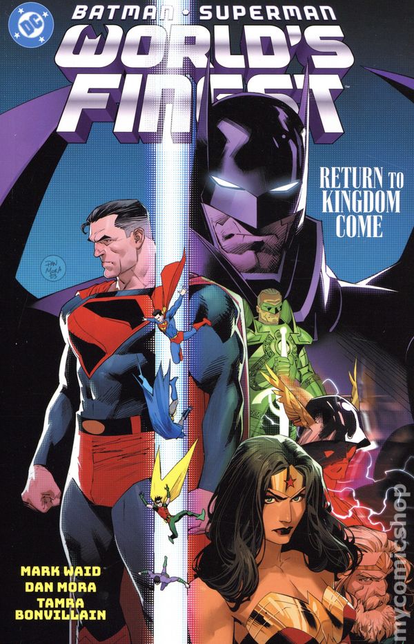 Volume 4 - 2nd and later printings. "Return to Kingdom Come!" Collects Batman/Superman: World's Finest (2022 DC) #20-24. Written by Mark Waid. Art and cover by Dan Mora. HEIR TO THE KINGDOM! Return to the world of Kingdom Come as the Flash discovers the fate of Superman's missing ward, Boy Thunder. The Multiverse-spanning World's Finest duo of Batman and Superman rush to Earth-22 to rescue their lost friend, only to discover a world that doesn't know the Multiverse and that is consumed by the thrall of the all-powerful Gog and his disciple, Thunderman! Join Mark Waid (The Flash, Shazam!) as he returns to his bestselling Kingdom Come story with artist Dan Mora (Detective Comics, Shazam!) to tell the origin of Gog and the horrors he created. Softcover, 144 pages, full color. Rated T+ Cover price $17.99.
