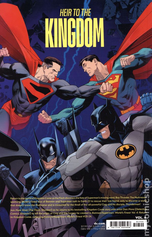 Volume 4 - 1st printing. "Return to Kingdom Come!" Collects Batman/Superman: World's Finest (2022 DC) #20-24. Written by Mark Waid. Art and cover by Dan Mora. HEIR TO THE KINGDOM! Return to the world of Kingdom Come as the Flash discovers the fate of Superman's missing ward, Boy Thunder. The Multiverse-spanning World's Finest duo of Batman and Superman rush to Earth-22 to rescue their lost friend, only to discover a world that doesn't know the Multiverse and that is consumed by the thrall of the all-powerful Gog and his disciple, Thunderman! Join Mark Waid (The Flash, Shazam!) as he returns to his bestselling Kingdom Come story with artist Dan Mora (Detective Comics, Shazam!) to tell the origin of Gog and the horrors he created. Softcover, 144 pages, full color. Rated T+ Cover price $17.99.