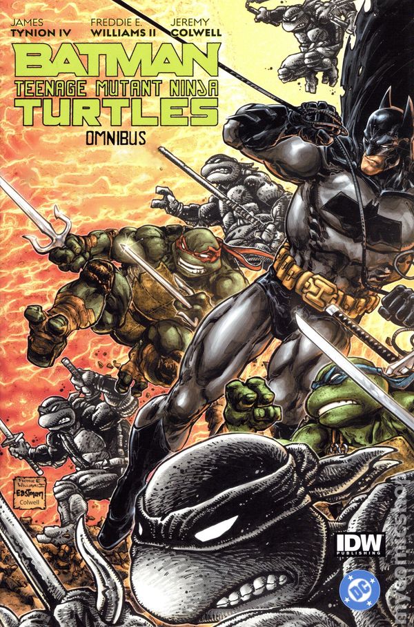 2nd and later printings. Collects Batman/Teenage Mutant Ninja Turtles (2015 DC) #1-6, Batman/Teenage Mutant Ninja Turtles II (2017 DC) #1-6, and Batman/Teenage Mutant Ninja Turtles III (2019 DC) #1-6. Written by James TynionIV. Art by Freddie Williams II and Kevin Eastman. Cover by Kevin Eastman. New York City's Heroes in a Half Shell and Gotham's Caped Crusader join forces against their greatest enemies—Krang, the Shredder, The Joker, and more— in a trio of tales that mash up the dimensions of the Turtles and Batman... putting all of reality in jeopardy! This massive omnibus includes plus hundreds of pages of behind-the-scenes material from artist Freddie E. Williams II and a brand-new introduction by Teenage Mutant Ninja Turtles co-creator Kevin Eastman! Hardcover, 8 1/2-in. x 11-in., 576 pages, full color. Cover price $99.99.