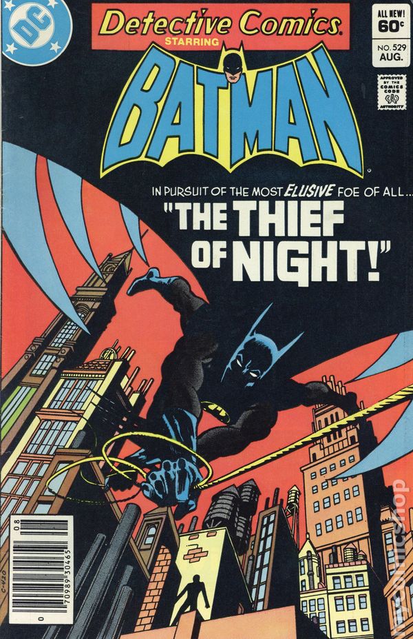 Newsstand Edition. Cover pencils by Ed Hannigan, inks by Dick Giordano. "The Thief of Night!", script by Doug Moench, pencils by Gene Colan, inks by Dick Giordano; The Batman encounters the black-clad Thief of Night, who steals precious gems to bring to his lover Nocturna; At the same time, Jason Todd considers going back to the circus, since Batman will not take him on as his new partner; continued in Batman 363. "Getting Up III: Lost in the Ozone," script by Joey Cavalieri, pencils by Paris Cullins, inks by Frank Giacoia; Rick helps free Ollie and the rest of the people Ozone glued to the exhibition rooms floor, and then reveals that the man in pursuit of Ozone is his own father, a psychotic scientist. 36 pgs., full color. $0.60. Cover price $0.60.
