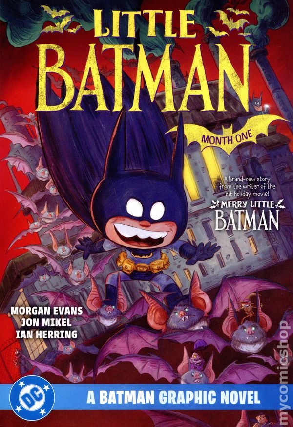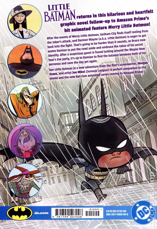 Written by Morgan Evans. Art by Jon Mikel. Cover by Jon Mikel. Taking place after the events of "Merry Little Batman," Gotham City finds itself reeling from the Joker's attack, and Damian Wayne (a.k.a. Little Batman) is eager to get back into the fight. That's going to be harder than it sounds, as Bruce now wants Damian to put the cowl aside and embrace the value of his secret identity. After a suspicious guest is found lurking around the Wayne New Year's Eve Party, it's up to Damian to find the balance between both of his personas and save the day yet again. See Little Batman in a new adventure from the film's screenwriter, Morgan Evans, after catching the rerelease of the breakout movie in theaters this winter. 36 pages, full color. Rated T+ Cover price $4.99.
