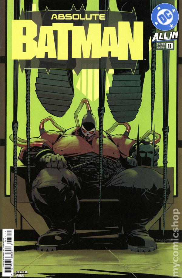 Written by Scott Snyder. Art by Nick Dragotta. Cover by Jenny Frison. ABSOLUTE CATWOMAN DEBUTS! Batmans final showdown with the monstrous Bane! Will he be able to overcome this unstoppable behemoth, or will he be trapped in Ark-M forever?! 24 pages, full color, rated 15+. Cover price $5.99.