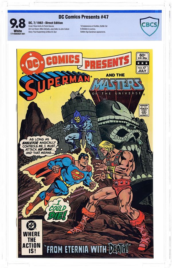 1st printing. Direct Edition. 1st appearance of He-Man and the Masters of the Universe in comics. Cover by Ross Andru and Frank Giacoia. Stories by Paul Kupperberg and Mike W. Barr. Art by Curt Swan, José Delbo, Mike DeCarlo and John Calnan. Skeletor attempts to force entry to Castle Grayskull. The energy discharge causes a storm that breaches dimensions, pulling Superman from Earth to Eternia. After a brief struggle with Skeletor, Superman teams up with He-Man to stop the villain in "From Eternia -- with Death!" by Paul Kupperberg, Curt Swan and Mike DeCarlo. Characters in this story: Battle Cat [Cringer] (introduction); Beastman (villain, introduction); Josh Coyle; The Goddess [Teela] (introduction); He-Man [Prince Adam] (introduction); Man-at-Arms (introduction); Skeletor (villain, introduction); Superman [Clark Kent]; Teela (introduction); Zoar (falcon, unnamed, introduction); Crusher (single appearance). Plus: Back-up story "Whatever Happened to Sandy, the Golden Boy?" by Mike W. Barr, José Delbo and John Calnan. Characters in this story: The Sandman [Wesley Dodds] (also in flashback); Sandy the Golden Boy [Sandy Hawkins] (also in flashback); The Shatterer [Dr. Price] (villain, single appearance, death); Dr. Raymond Baxter (in flashback); Roger Phelps (security guard). 32 pages, full color.