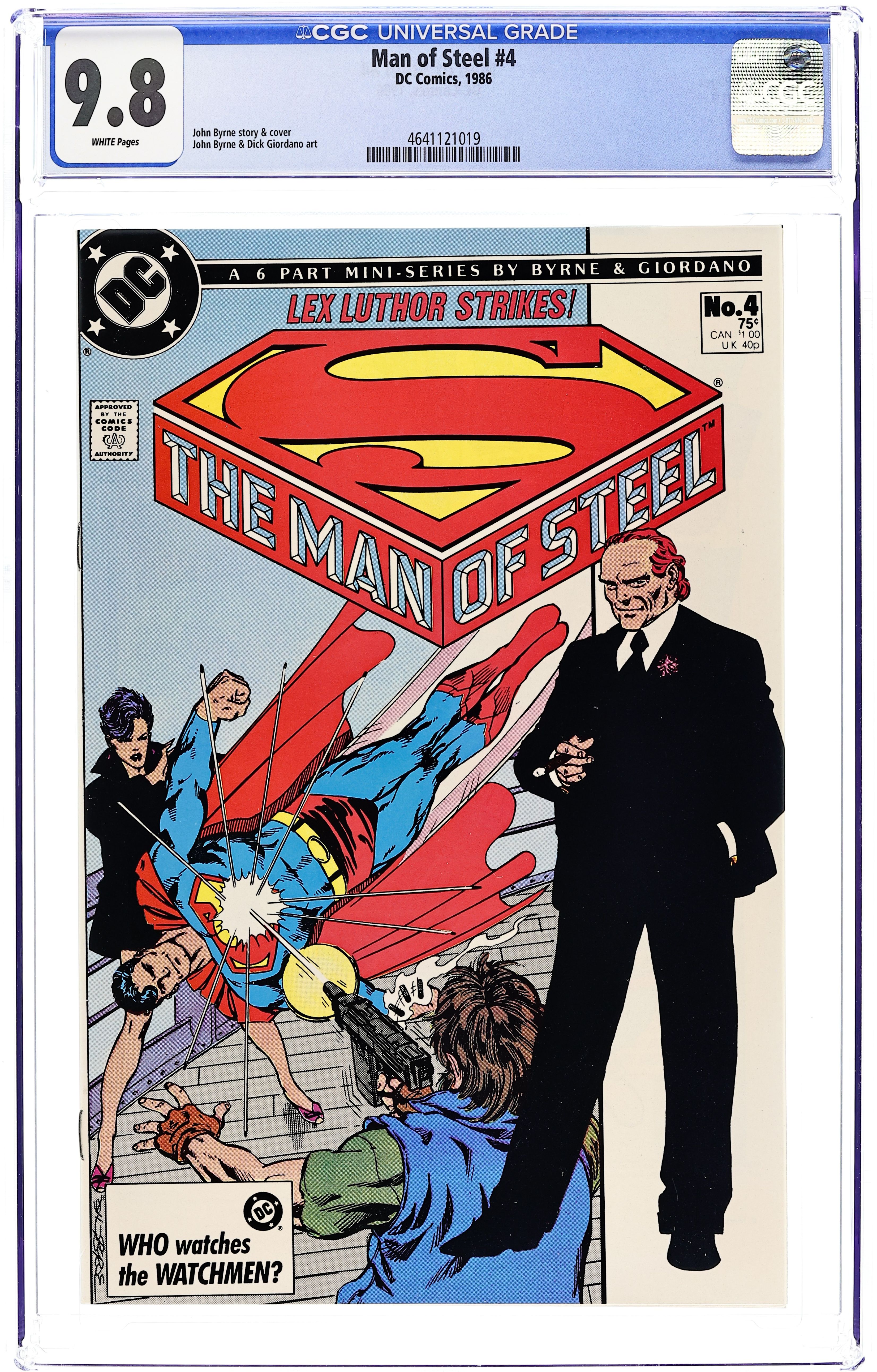 Published just a few months after Crisis on Infinite Earths, John Byrne's The Man of Steel updated the saga of Superman for modern audiences, changing certain aspects of the character in the process. Issue #4, which finds Lois and Clark on a cruise that gets hijacked, establishes Lex Luthor as a scheming, power-mad business mogul who is jealous of Superman's increasingly felt presence in Metropolis. Prior to Crisis, Luthor was a brilliant (if crooked) scientist. Written and drawn by John Byrne, with inks by Dick Giordano. Cover price $0.75.