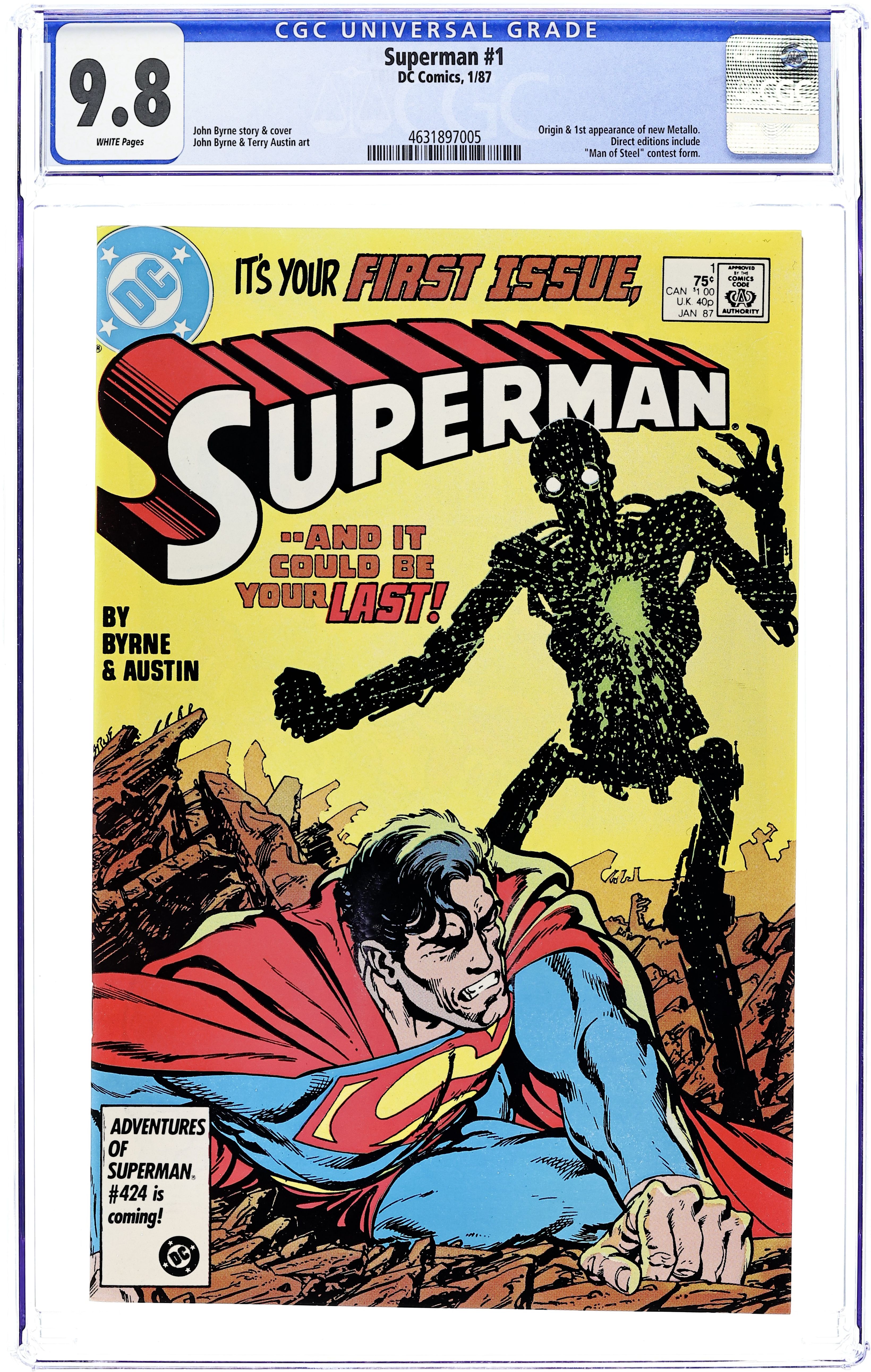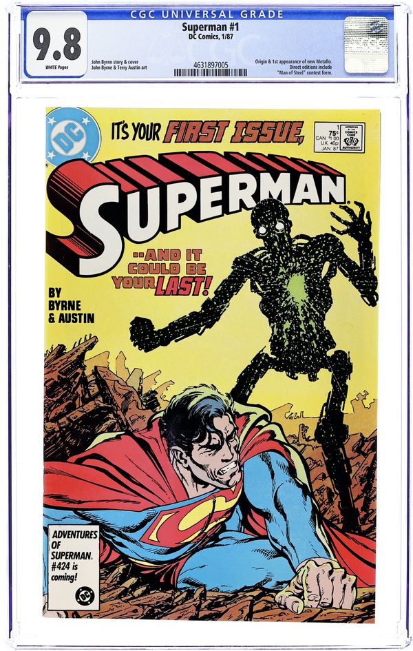 Direct Edition. "Heart of Stone!" Story by John Byrne. Art by John Byrne and Terry Austin. In the wake of Crisis on Infinite Earths, DC decides to revamp and reinvigorate their universe, and their heroes. First up, why none other than the Man of Steel himself. Superstar John Byrne, known for his acclaimed work on Marvel's Uncanny X-Men and the Fantastic Four, re-imagines the Last Son of Krypton for a whole new generation. However, Superman's first issue in this historical relaunch just may be his last as he comes face-to-face with Metallo, the Man with the Kryptonite Heart! Featuring Lois Lane. NOTE: Also see Man of Steel (1986) #1-6 for the lead in story to this series. Superman was created by Jerry Siegel and Joe Shuster. Cover price $0.75.