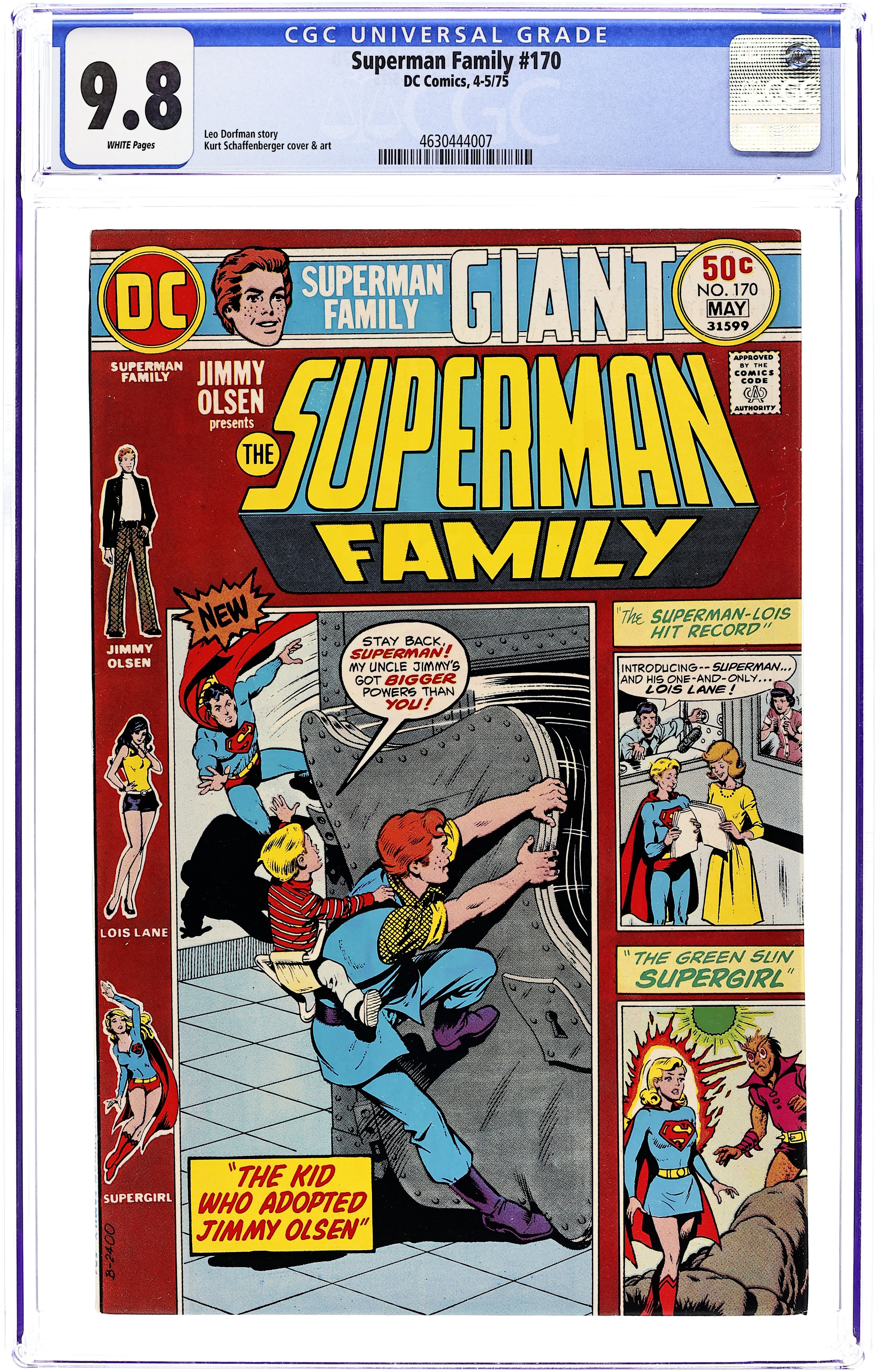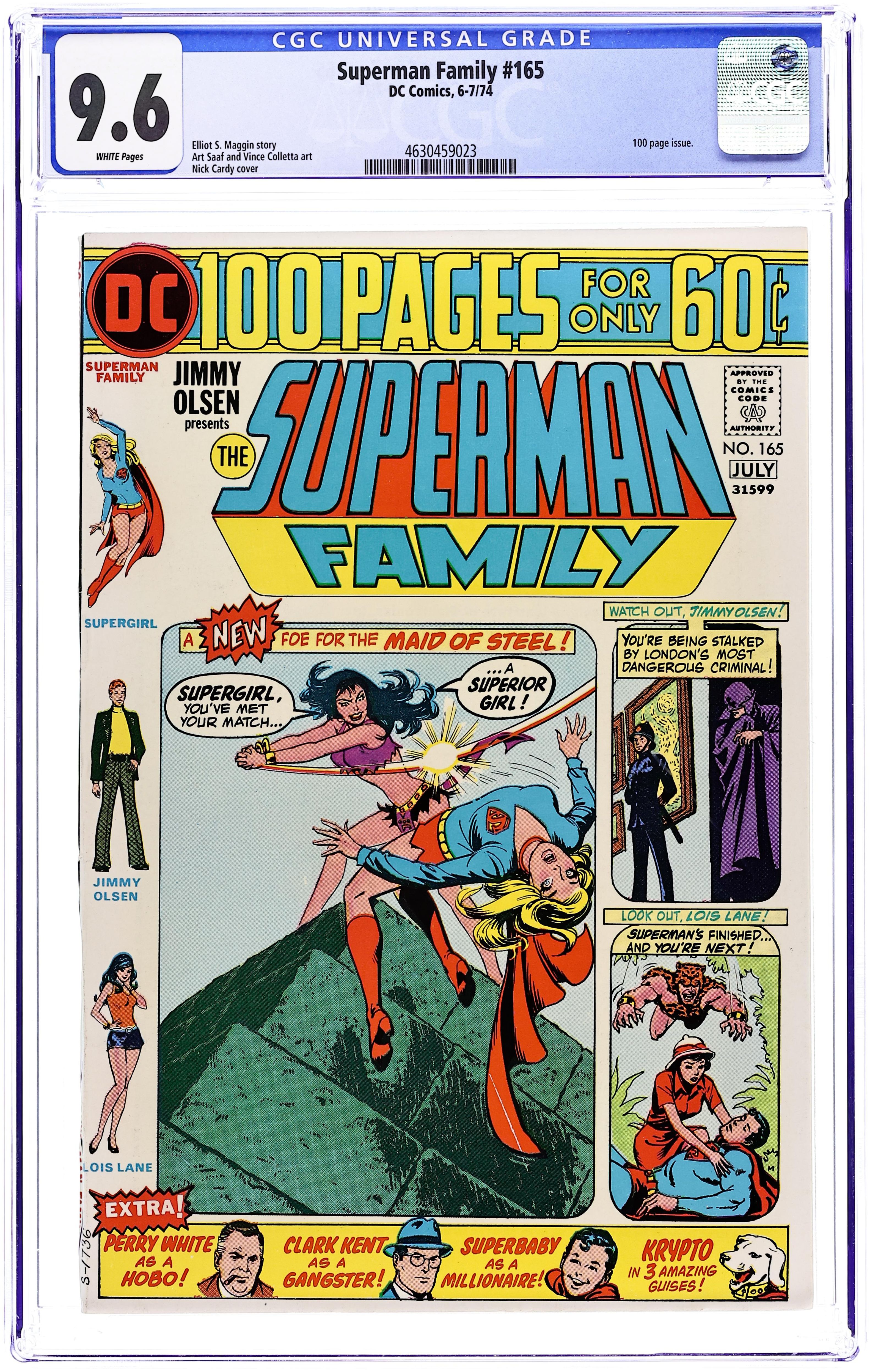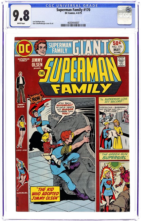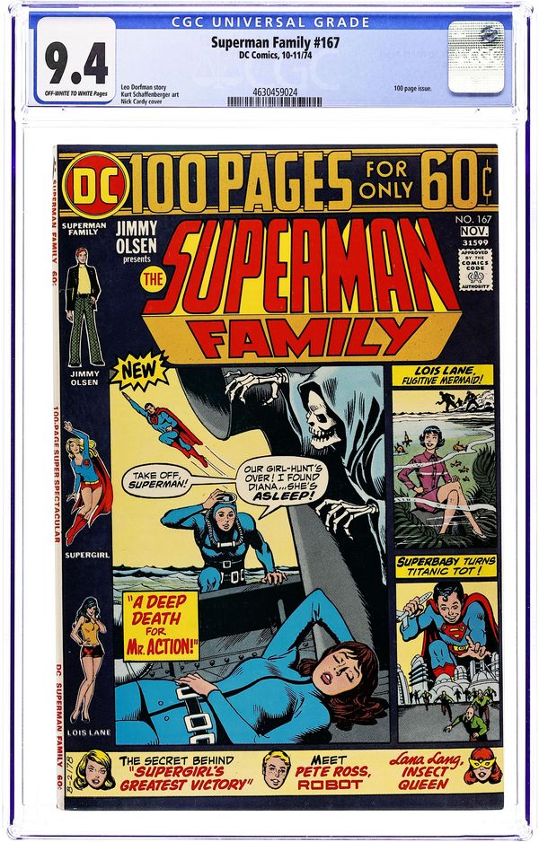 100-page giant. New Jimmy Olsen stories: "A Deep Death for Mr. Action" and "Trail of the Spider" (scripts by Leo Dorfman, art by Kurt Schaffenberger). Reprints: Lois Lane in "The Amazing Hydro-Girl" (script by Otto Binder, art by Schaffenberger), Supergirl in "Supergirl's Greatest Victory" (script by Binder, art by Jim Mooney), Superbaby in "The Lair of Brainiac" (pencils by Curt Swan, inks by George Klein), Superboy's Pal Pete Ross in "the Day Pete Ross Became a Robot" (art by George Papp), Lucy Lane in "Super Lucy Lane" (art by John Forte), and Lana Lang in "the Insect Queen of Smallville" (script by Binder, art by Papp). Two-page "Fact File on the Superman Family" character profiles. Two-page "Super Pets and Super-Threats" animal profiles. Nick Cardy cover. Cover price $0.60.