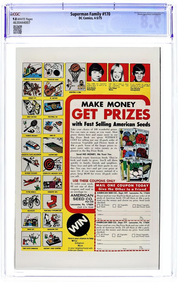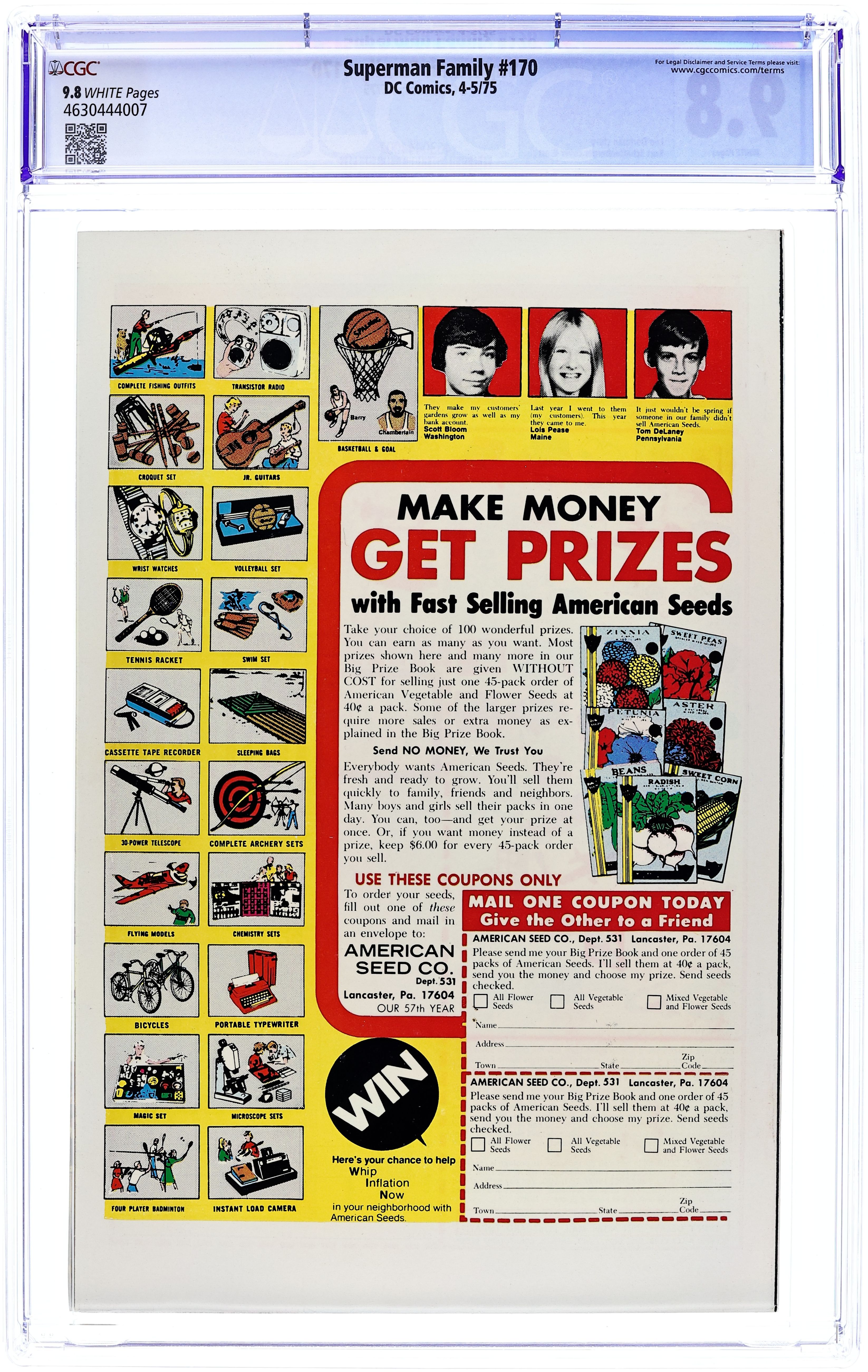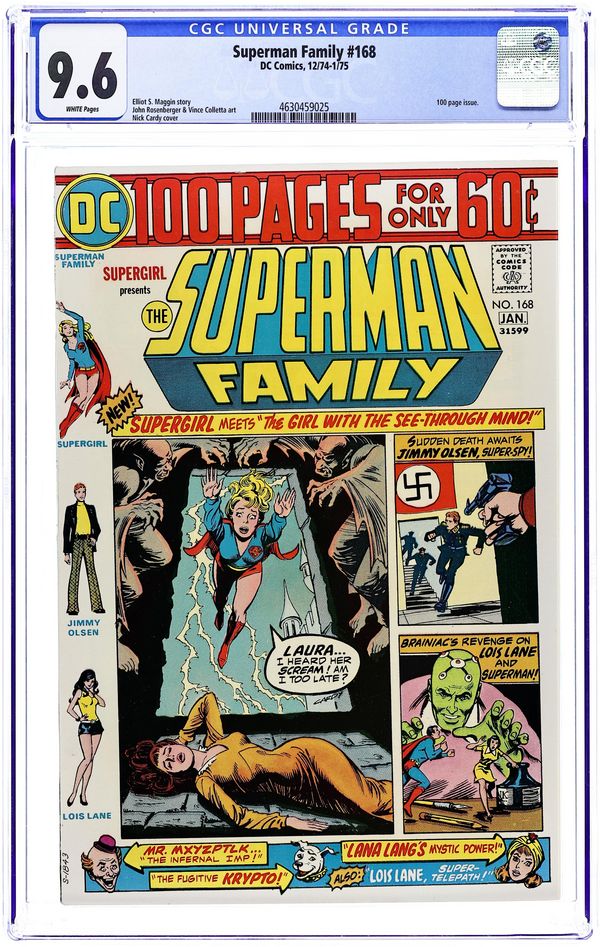 100-page giant. New Supergirl story, "The Girl With the See-Through Mind" (script by Elliot Maggin, pencils by John Rosenberger, inks by Vince Colletta). Reprints: Jimmy Olsen in "Jimmy's D-Day Adventure" (script by Leo Dorfman, pencils by Curt Swan, inks by George Klein), Lois Lane in "Lois Lane, Super-Telepath" (script by Otto Binder, art by Kurt Schaffenberger), Krypto in "The Fugitive Krypto" (art by George Papp), Mr. Mxyzptlk in "The Infernal Imp" (art by Swan/Klein), Lana Lang in "Lana Lang's Mystic Power" (art by Papp), and Brainiac in "Brainiac's Super-Revenge" (art by Swan/Klein). Also in this issue: two-page "E.S.Peek at Lena Thorul," crossword puzzle by Bob Rozakis, and "Comedy Cover Capers." Nick Cardy cover. Cover price $0.60.