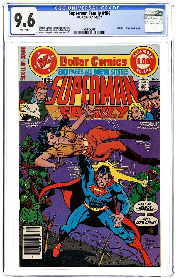 Cover pencils by Jose Luis Garcia-Lopez, inks by Dick Giordano. The Bug Lady starring Jimmy Olsen, script by Tom DeFalco, pencils by Chic Stone, inks by Joe Orlando. Save My Friend, Kill Your World! starring Superman, script by Gerry Conway, pencils by Curt Swan, inks by Murphy Anderson. Dateline: A Kingdom of the Mad starring Lois Lane, script by Gerry Conway, pencils by Win Mortimer, inks by Joe Giella. Gunfight at the Canine Corral! starring Krypto, script by Bob Toomey, pencils by Juan Ortiz, inks by Vince Colletta. Journey to the Center of Nowhere starring Nightwing and Flamebird, script by Paul Kupperberg, pencils by Ken Landgraf, inks by Romeo Tanghal. Rendezvous with Reality starring Supergirl, script by Jack C . Harris, pencils by Alan Weiss, inks by Joe Rubinstein. 84 pgs. $1.00. Cover price $1.00.