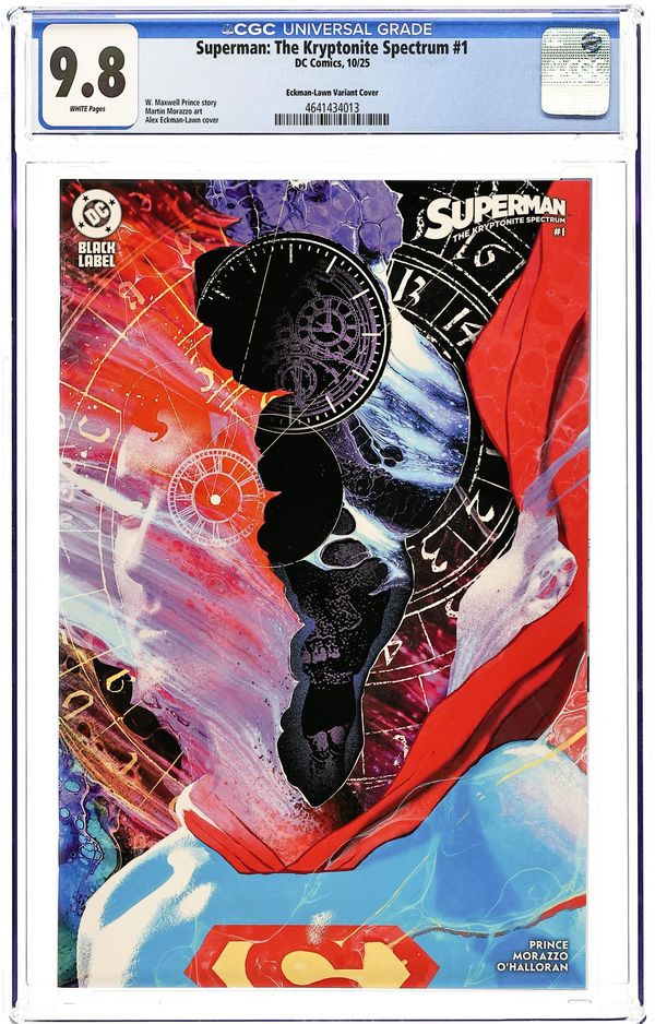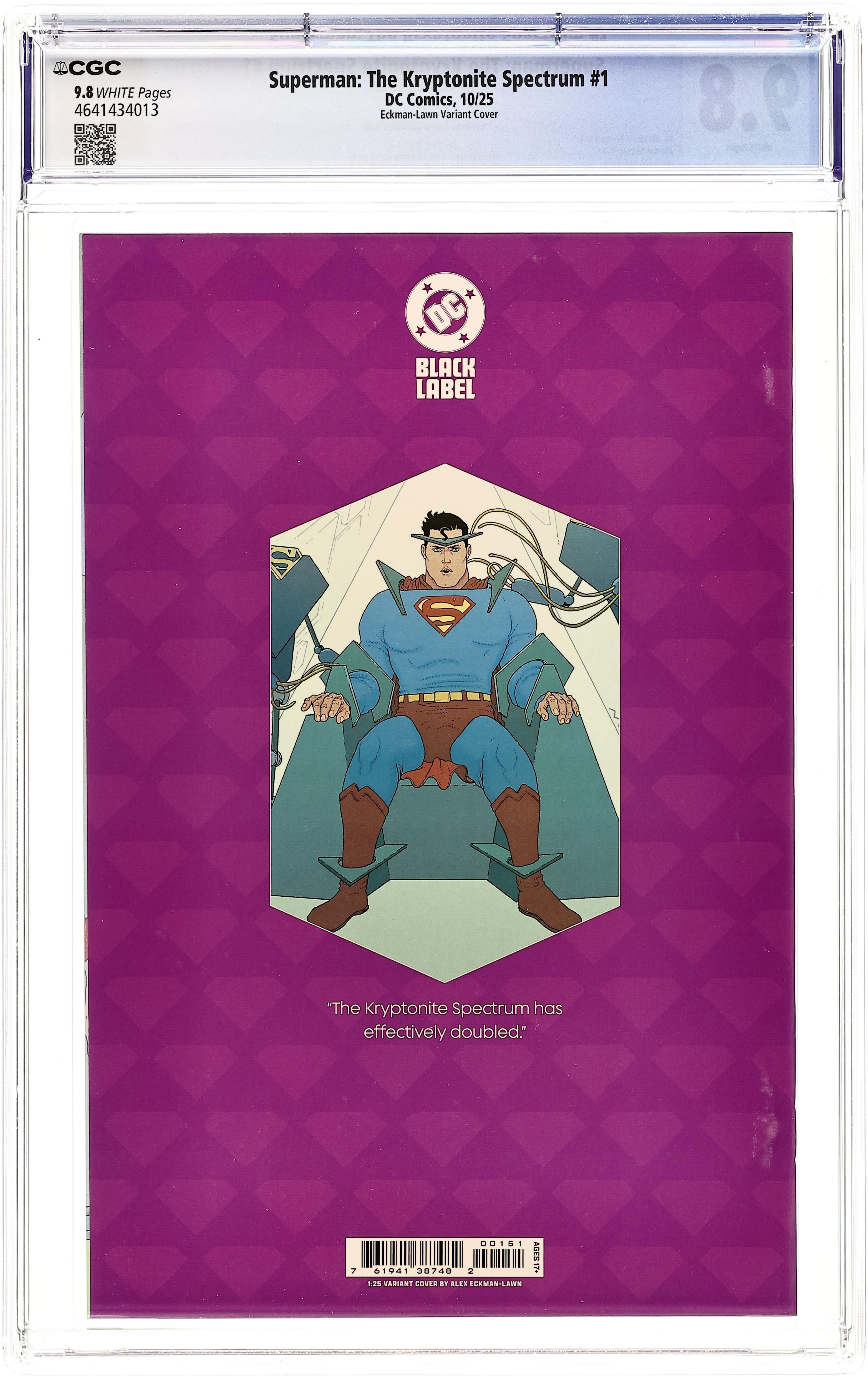 Limited 1 for 25 Retailer Incentive Variant Cover. Written by W. Maxwell Prince. Art by Martin Morazzo. Cover by Alex Eckman-Lawn. The team behind the critically acclaimed Ice Cream Man comic comes to DC to apply its singular storytelling style to none other than the Man of Steel! Four new Kryptonites have been discovered in deep space, and Superman needs to know just what, exactly, they do to him--lest the colorful rocks of his home planet fall into evil hands! With Batman at Superman's side, this DC Black Label Superman event explores the consequences of each never-before-seen variety of Kryptonite--all in the formal and boundary-pushing fashion that W. Maxwell Prince, MartÃn Morazzo, and Chris O'Halloran are celebrated for! 32 pages, full color. Rated T+ Cover price $5.99.