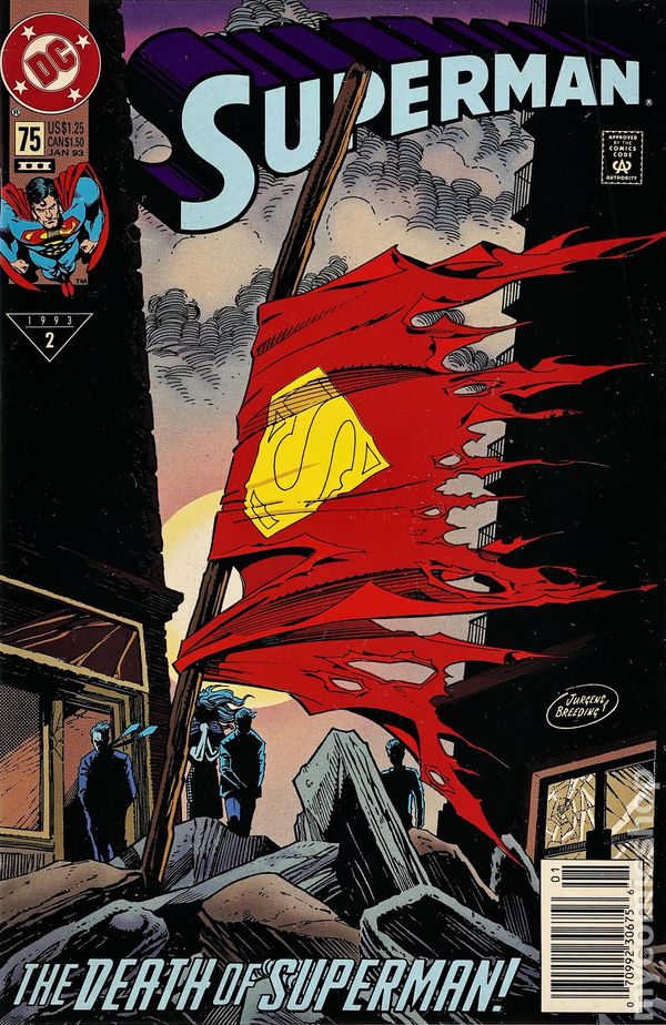 This is an unbagged version of Superman 75 Black Bag Memorial Edtion. 1st printing. Doomsday! Part 7 of 7. "Doomsday!" Story by Dan Jurgens. Art by Dan Jurgens and Brett Breeding. Here it is, the issue that rocked the DC Universe. An unstoppable force named Doomsday crash landed on Earth and has cut a swath of death and destruction across the country, all the way to Metropolis. Even the Justice League, the world's premiere super-team, was powerless before this creature's might. Now one man stands defiantly in Doomsday's way and vows that the creature's insanity stops here. Superman fights his strongest opponent to the death in the streets of Metropolis. NOTE: The event of "The Death of Superman" was so huge that it was reported on by the national media. - Odinson, Lonestar Comics Archivist Cover price $2.50.
