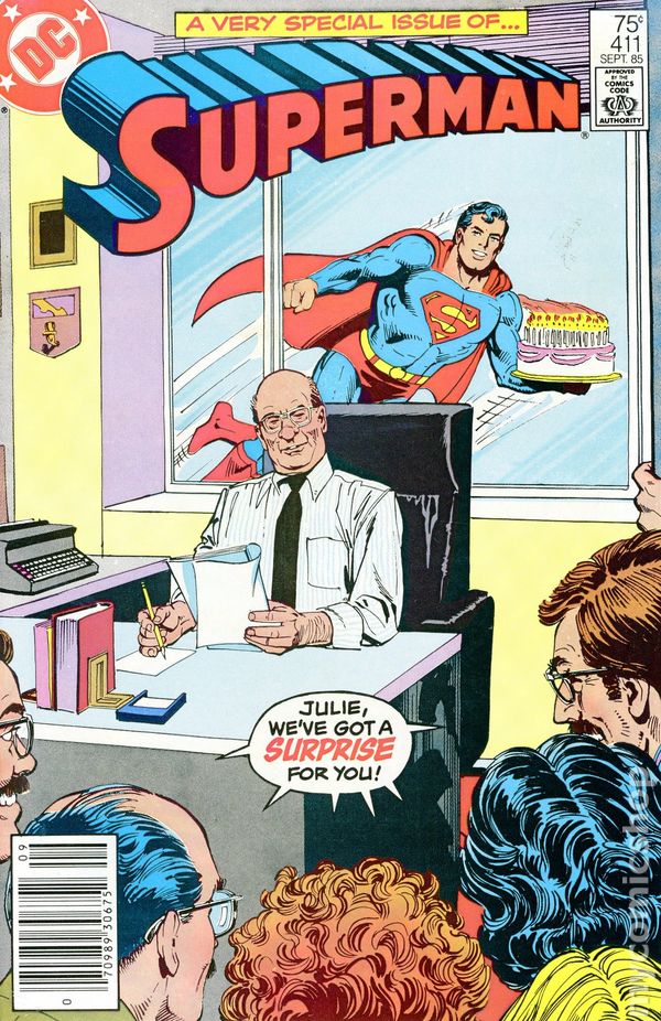 Cover art by Eduardo Barreto. The Man Who Saw Superman Die!, script by Paul Kupperberg, pencils by Eduardo Barreto, inks by Dave Hunt; Ed Hamilton has a vision of the future where he sees Superman shot and killed by a handgun and seeks to stop that future from taking place. Never Too Busy For A Fan!, script by Joey Cavalieri, pencils by Curt Swan, inks by Bob Oksner. 36 Pages, Full Color. Cover price $0.75.