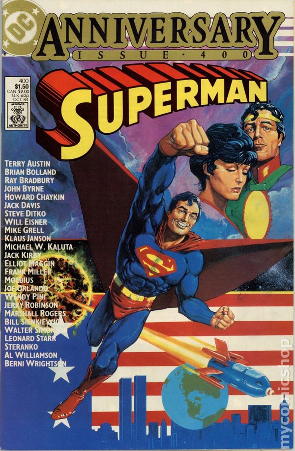 Direct Edition. Giant-Sized 400th Anniversary issue! Introduction by Ray Bradbury. How do people look at Superman? How will we see him in the future, as historians and scholars evaluate this figure who so dominated the 20th century? When he is no longer with us...who will we think he was? Come into the future with us to find out and explore..."The Living Legends of Superman." Script by Elliot Maggin. Art by Joe Orlando (4 pages), Al Williamson (8 pages), Frank Miller (4 pages), Marshall Rogers & Terry Austin (7 pages), Wendy Pini (3 pages), Michael W. Kaluta & Kelly Alder (6 pages), Klaus Janson (10 pages), Jim Steranko (10 pages, and Steranko also handles the script, letters & colors for his sequence). Pin-ups by: Brian Bolland, Jack Kirby & Terry Austin, John Byrne, Jack Davis, Leonard Starr (Superman flying with Annie and Sandy), Walt Simonson, Bernie Wrightson, Will Eisner (Superman and the Spirit), Steve Ditko, Mike Grell, Moebius, Bill Sienkiewicz, Jerry Robinson (Batman, Robin, Joker, Penguin appear in pin-up). Cover by Howard Chaykin. Back cover by Frank Miller. 68 Pages, Full Color. Cover price $1.50.
