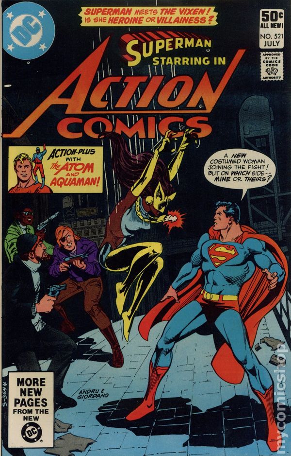 Direct Edition. Cover pencils by Ross Andru, inks by Dick Giordano. "The Deadly Rampage of the Lady Fox," script by Gerry Conway, pencils by Curt Swan, inks by Frank Chiaramonte; In New York City, the Vixen steals a van full of furs that belong to entrepreneur Mordecai Mule; Superman, attending a function at Madison Square Garden, learns of the robbery and gives chase; Superman and Vixen team up to stop a horde of elephants. "Grow, Little Growfish!", script by Bob Rozakis, pencils by Alex Saviuk, inks by Vince Colletta; Off the coast of Virginia, Aquaman experiments with his telepathic powers by sending out a routine mental scanning wave; He discovers a large, gelatinous organism that shrinks in size; Aquaman contacts the Atom, who teleports over to investigate. 36 Pages, Full Color, $0.50. Cover price $0.50.