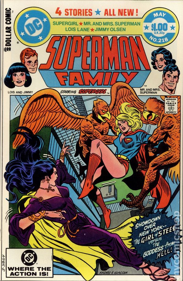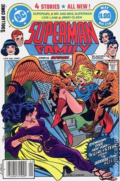 Newsstand Edition. Cover pencils by Ross Andru, inks by Frank Giacoia. The Goddess from Hell! starring Supergirl, script by Paul Kupperberg, pencils by Win Mortimer, inks by Vince Colletta; Sheree Hatcher makes a deal with Hecate; the cost is Supergirl's soul. The Ones That Almost Got Away! starring Superman's Pal Jimmy Olsen, script by Paul Kupperberg, pencils by Jose Delbo, inks by Joe Giella. Strangers in the Snow! starring Superman's Girl Friend Lois Lane, script by Tamsyn O'Flynn, pencils by Bob Oksner, inks by Vince Colletta. Kryptonite-Mare!--Mr. & Mrs. Superman, script by E. Nelson Bridwell, pencils by Kurt Schaffenberger, inks by Frank Chiaramonte. 52 pgs. $1.00. Cover price $1.00.