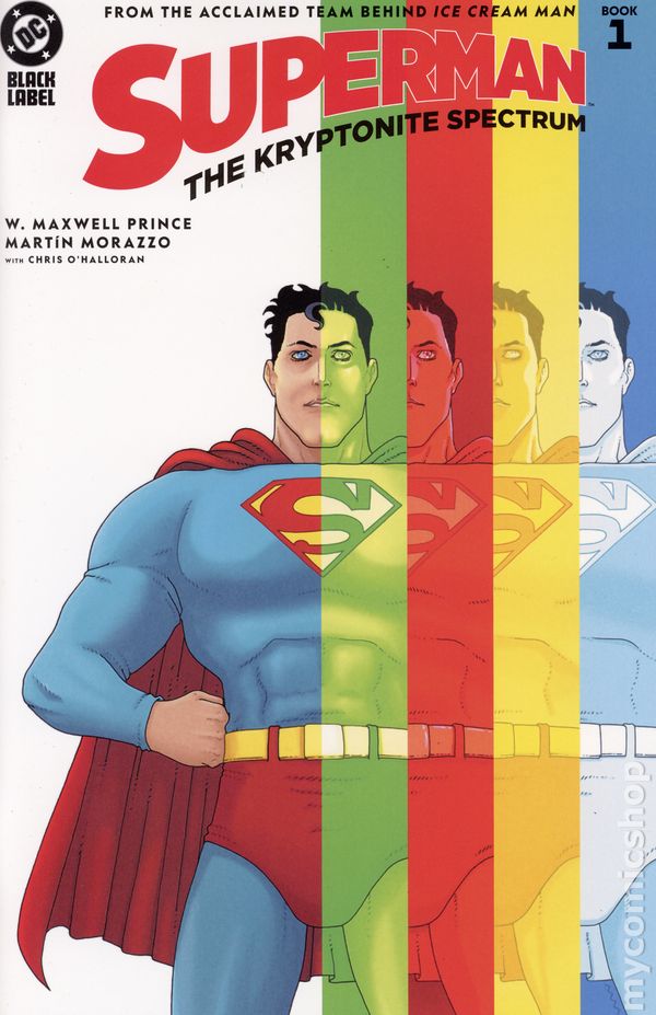 Written by W. Maxwell Prince. Art by Martin Morazzo. Cover by Martin Morazzo. The team behind the critically acclaimed Ice Cream Man comic comes to DC to apply its singular storytelling style to none other than the Man of Steel! Four new Kryptonites have been discovered in deep space, and Superman needs to know just what, exactly, they do to him--lest the colorful rocks of his home planet fall into evil hands! With Batman at Superman's side, this DC Black Label Superman event explores the consequences of each never-before-seen variety of Kryptonite--all in the formal and boundary-pushing fashion that W. Maxwell Prince, Martín Morazzo, and Chris O'Halloran are celebrated for! 32 pages, full color. Rated T+ Cover price $5.99.