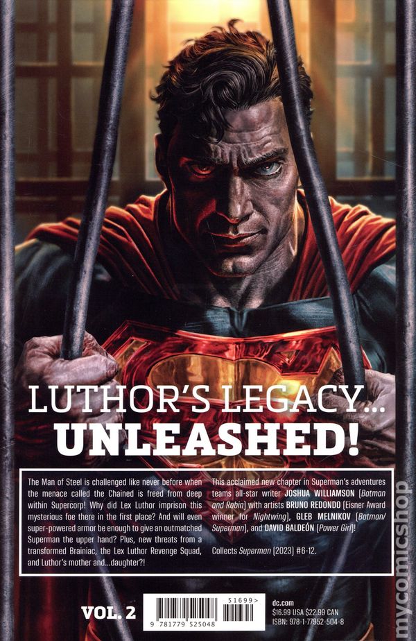 Volume 2 - 2nd and later printings. "The Chained!" Collects Superman (2023 DC) #6-12. Written by Joshua Williamson. Art by Gleb Melnikov, David Baldeon, Bruno Redondo, Dan Jurgens, Edwin Galmon, Norm Rapmund, Jamal Campbell, and Caio Filipe. Cover by Jamal Campbell. Back Cover by Lee Bermejo. The Man of Steel is challenged like never before when the menace called The Chained is freed from deep beneath Supercorp! Why did Lex Luthor imprison this mysterious foe there in the first place? And will even super-powered armor be enough to give an outmatched Superman the upper hand? Plus, new threats from a transformed Brainiac, the Lex Luthor Revenge Squad, and Luthors mother and...daughter?! This acclaimed new chapter in Supermans adventures teams all-star writer Joshua Williamson (Batman and Robin) with artists Bruno Redondo (Eisner Award winner for Nightwing), Gleb Melnikov (Batman/Superman), and Dan Jurgens (The Death of Superman)! Softcover, 176 pages, full color. Cover price $16.99.