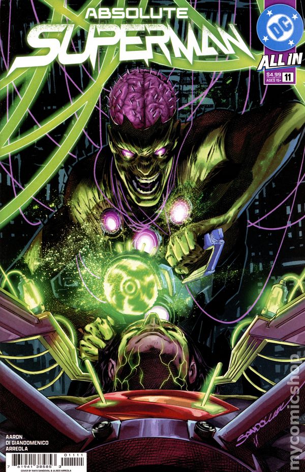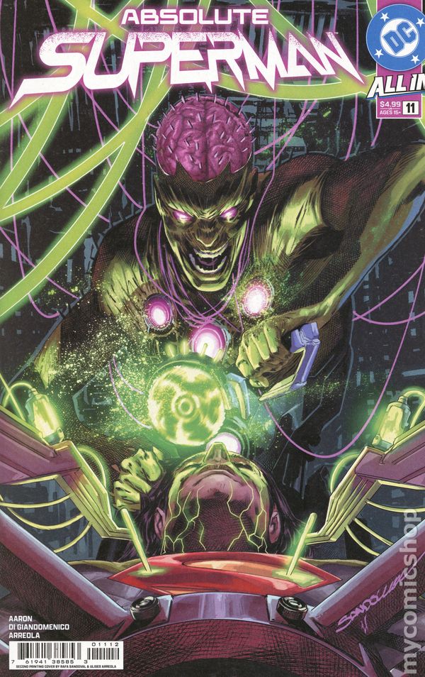 2nd Printing. Written by Jason Aaron. Art by Carmine Di Giandomenico. Cover by Rafa Sandoval. THE HORRORS OF ABSOLUTE BRAINIAC, REVEALED! His stolen alien technology is at the heart of Lazarus Corp's global success. But he operates out of a seedy lair, packed with bottled cities...cities he tortures relentlessly, just to hear the faint chorus of screams. Who is the mysterious Brainiac? And why is he so interested in the Last Son of Krypton? 28 pages, full color. Rated T+ Cover price $4.99.