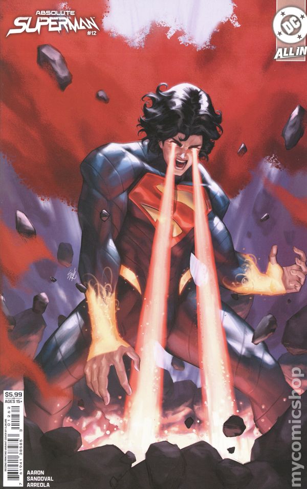 2nd Printing. Written by Jason Aaron. Art by Carmine Di Giandomenico. Cover by Rafa Sandoval. THE SECRET ORIGIN OF ABSOLUTE SUPERMAN! Something strange happened in the American heartland several years ago. Something that brought fear and darkness to a small Kansas town...and forever changed the lives of one kindly couple. Welcome to Smallville. 28 pages, full color. Rated T+ Cover price $4.99.