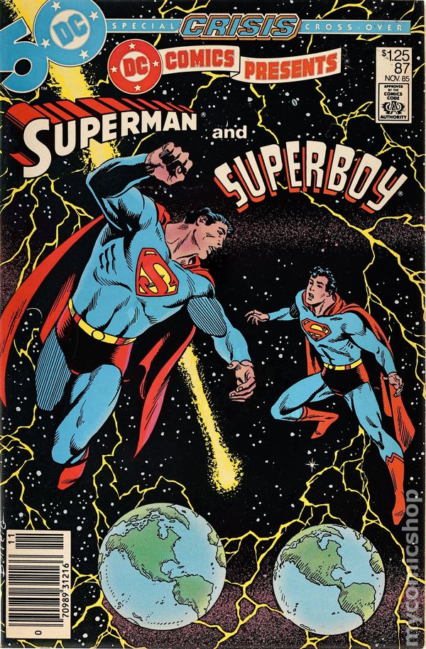 Newsstand Edition. Crisis on Infinite Earths cross-over. Zapped by an alien ray, Superman hops dimensions and teams up with Superboy-Prime to battle Polarians on Earth-Prime in the 24-page "Year of the Comet." Continued in Adventures of Superman (1939) #414. Script by Elliot S! Maggin, art by Curt Swan & Al Williamson. Plus: the 16-page "Origin of Superboy-Prime" by Maggin, Swan & Williamson. Cover by Eduardo Barreto. Cover price $1.25.