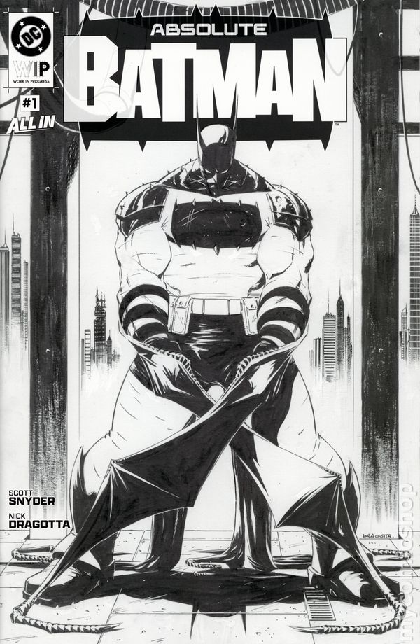 Written by Scott Snyder. Art by Nick Dragotta. Cover by Nick Dragotta. DC'S ARTIST EDITION LINE CONTINUES! EXPERIENCE THE ORIGINAL ART OF DC'S GREATEST ISSUES AND ARTISTS AT ORIGINAL ARTBOARD SIZE! Step into the world of comics like never before with DC W.I.P. Get up close and personal with the stunning original artwork from one of comics' greatest artists. Featuring the original art of Absolute Batman #1 from Nick Dragotta! The brilliance of Dragotta's work can be seen like never before in this massive oversize presentation. Includes a brand-new introduction by Dragotta. Don't miss your chance to own this incredible, one-of-a-kind piece of comics history. 48 pages, full B&W Cover price $14.99.
